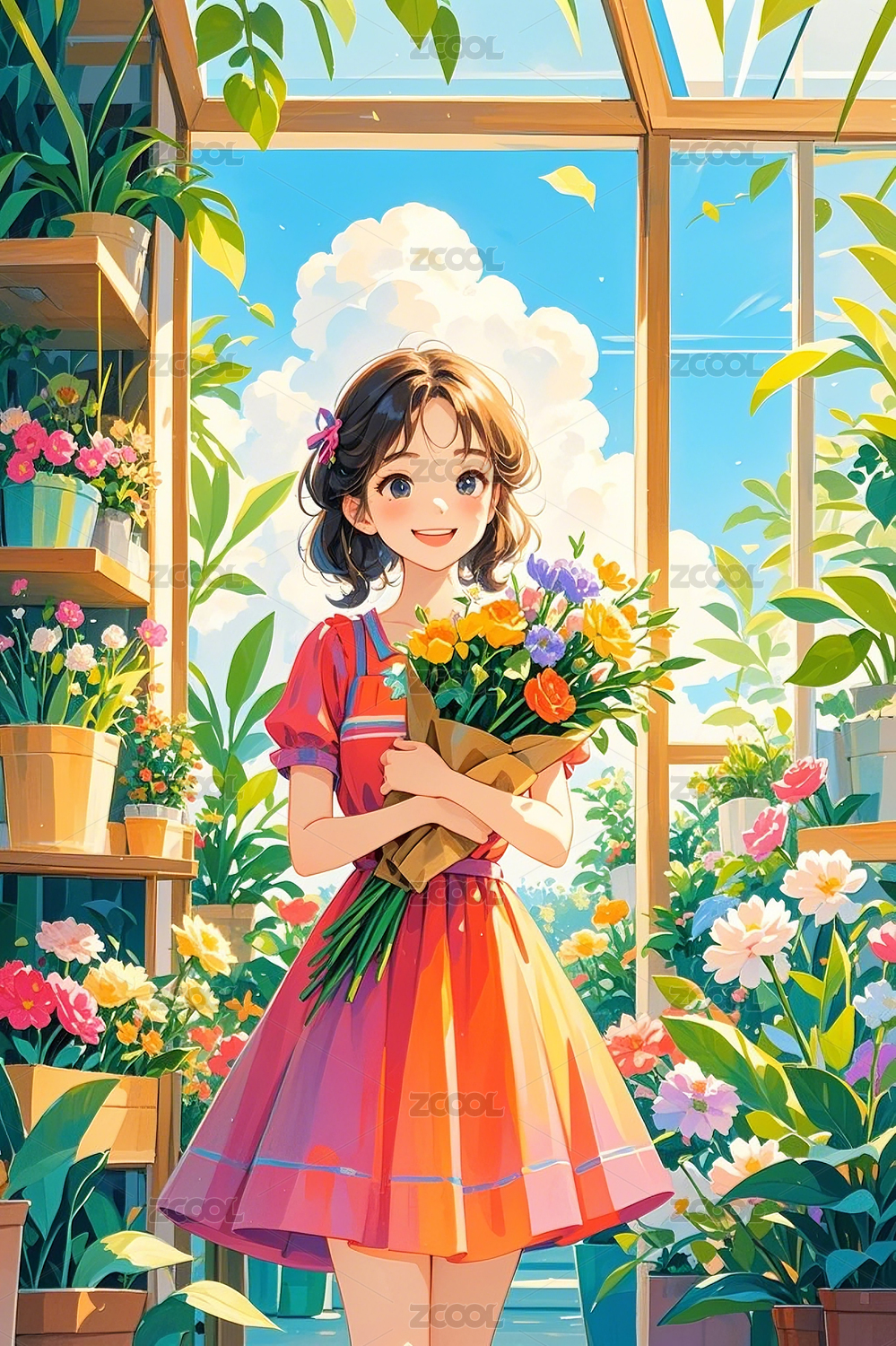 阳光温室中浇花的少女