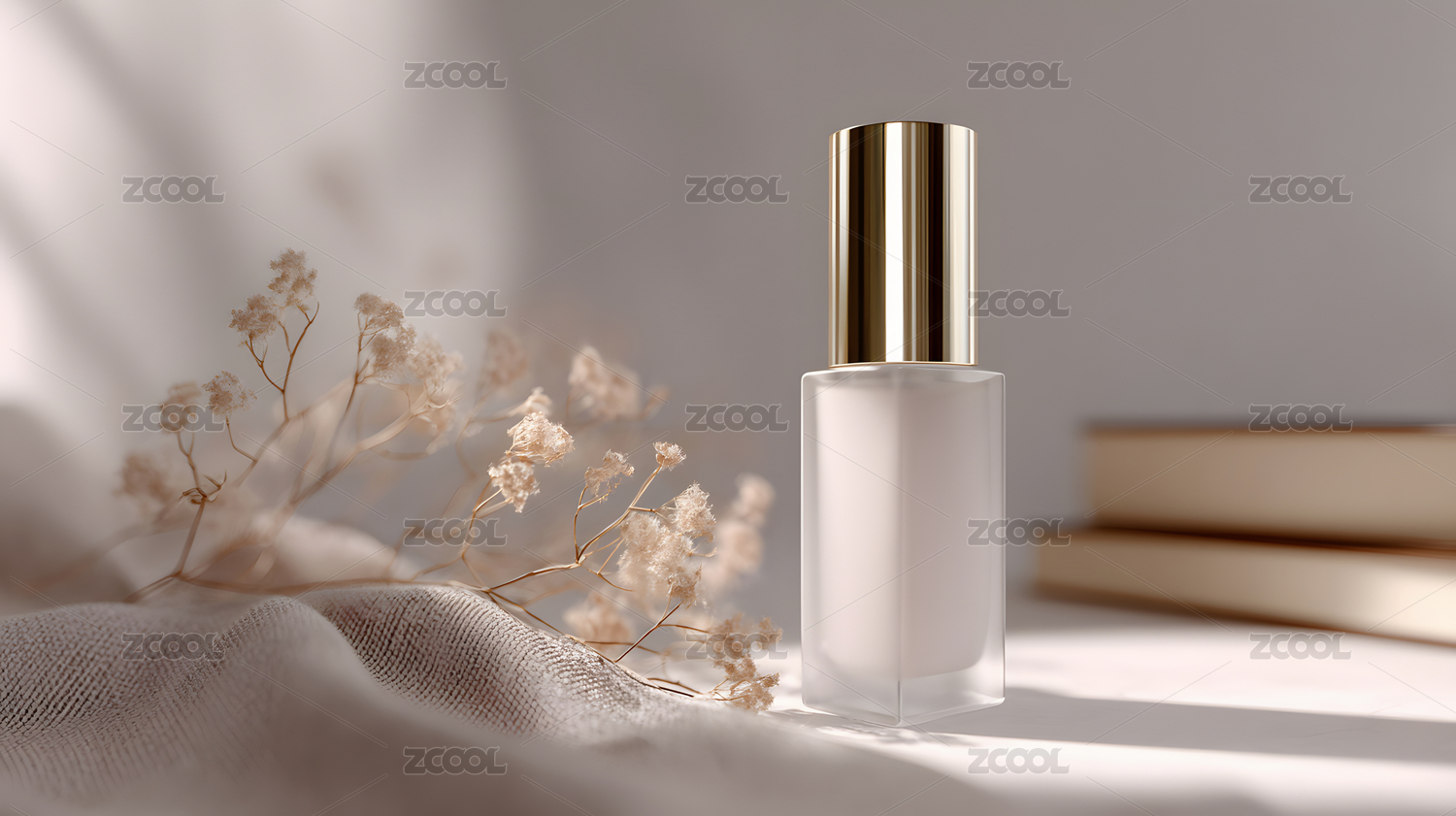 护肤品瓶体与干花摆设特写