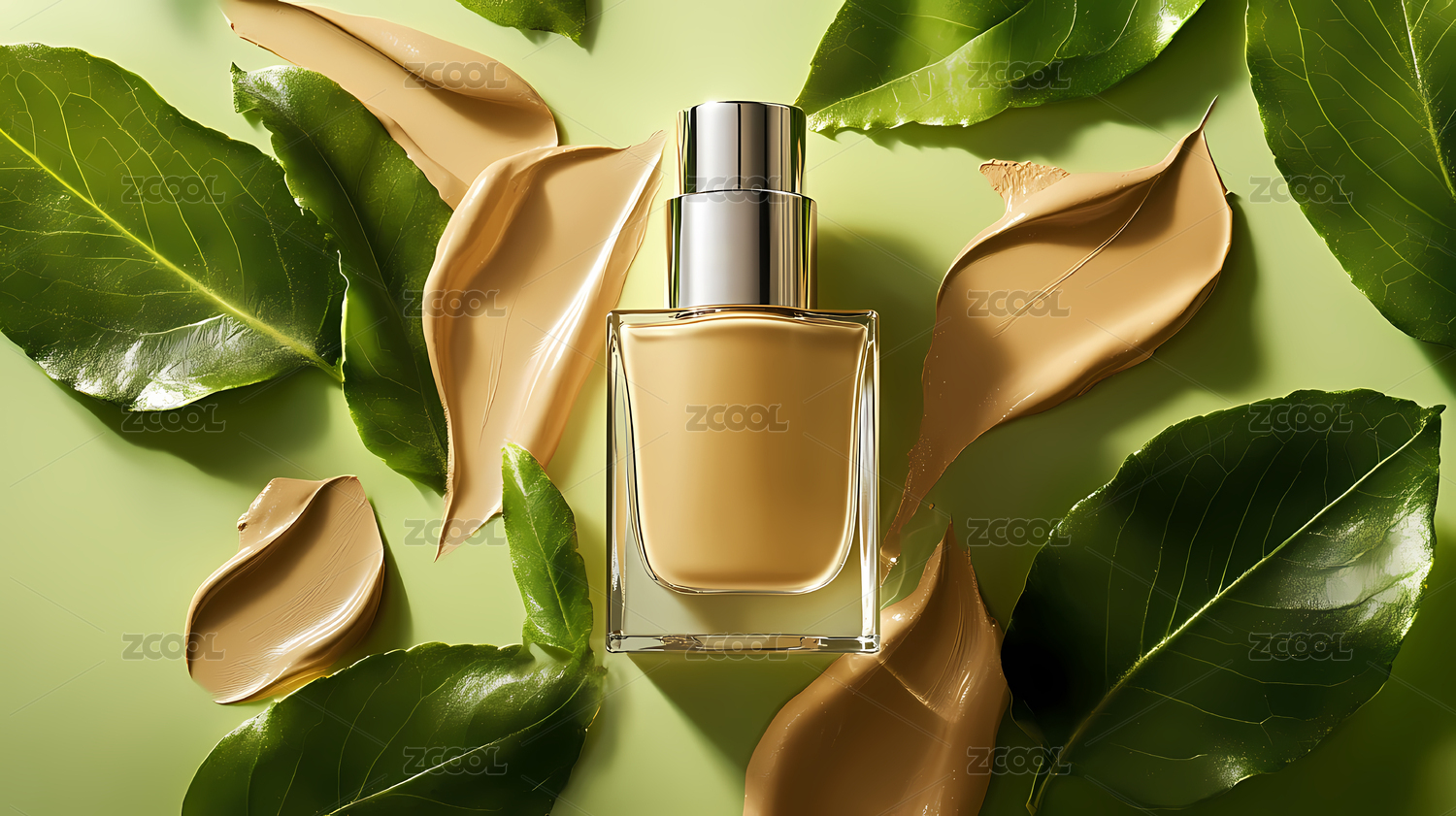 粉底液与绿叶的特写