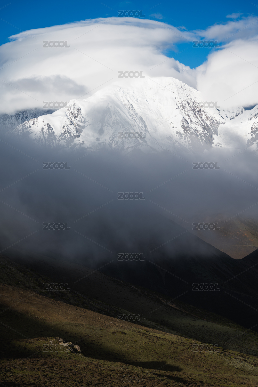 中国西藏自治区高原上云雾缭绕的雪山