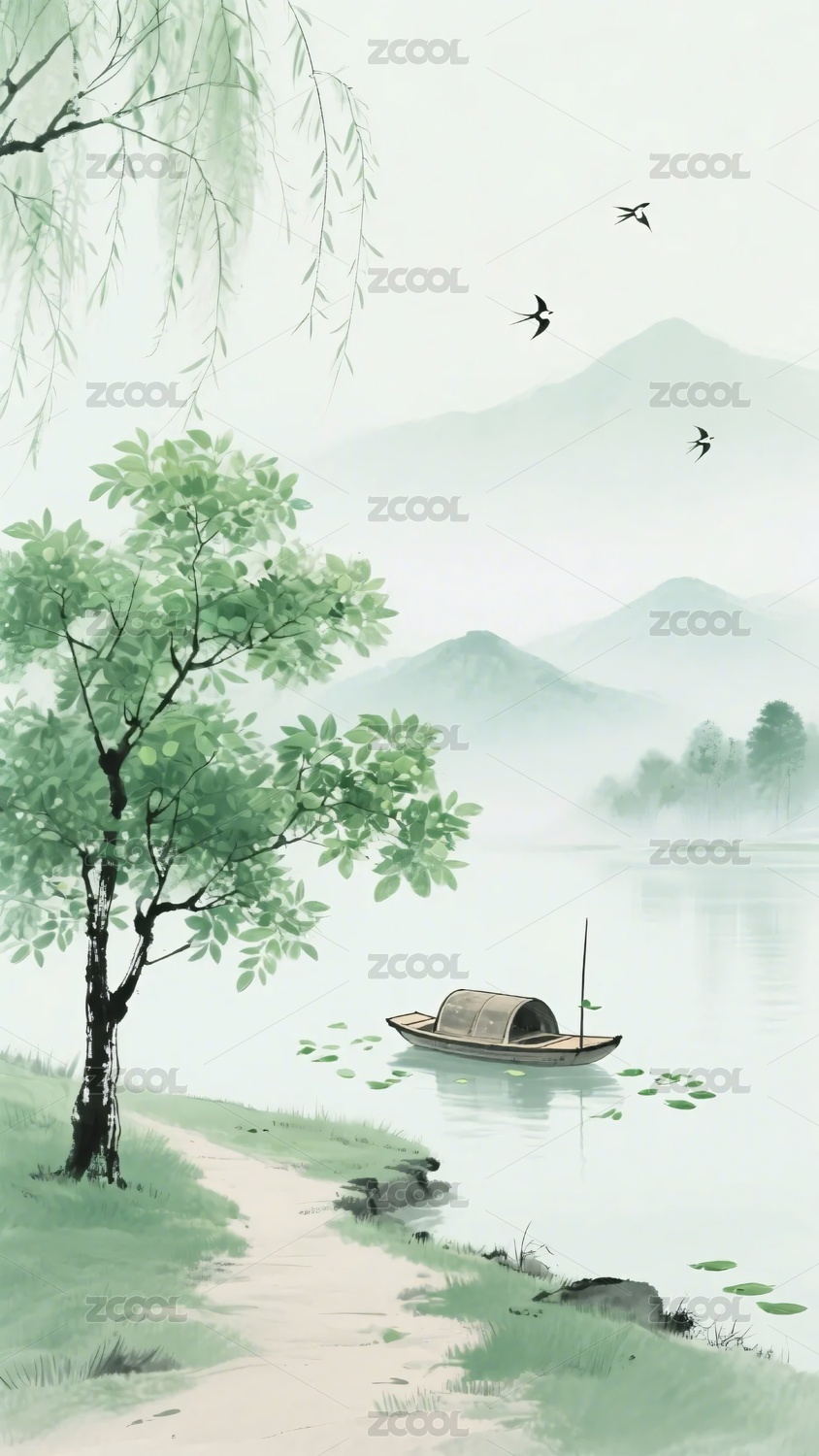 柳树,人物,红衣,湖水,插画,古风,意境,自然,风景,宁静
