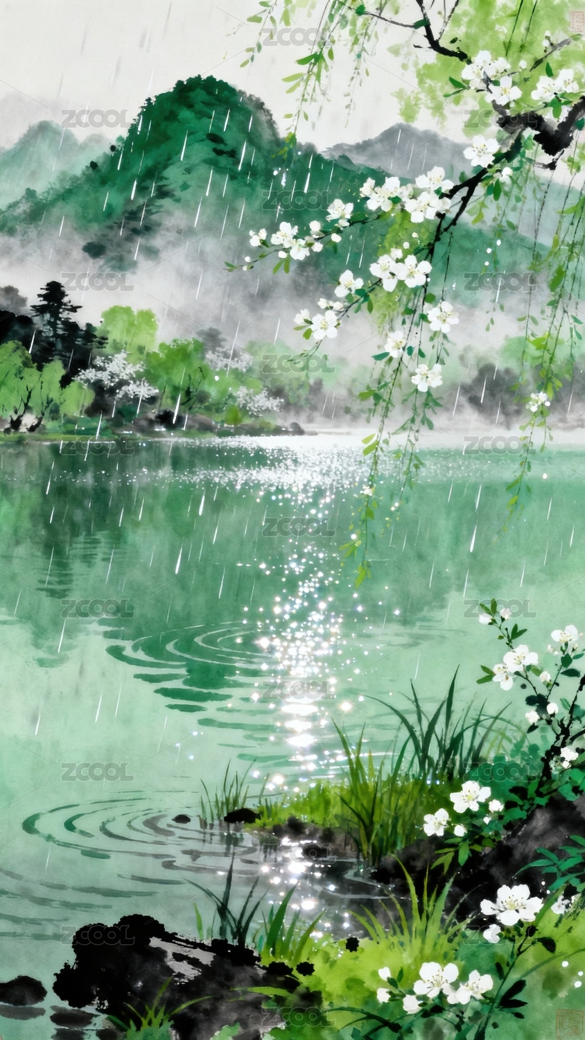 红衣人,垂柳,湖水,插画,古风,意境,自然,人物,景观,宁静