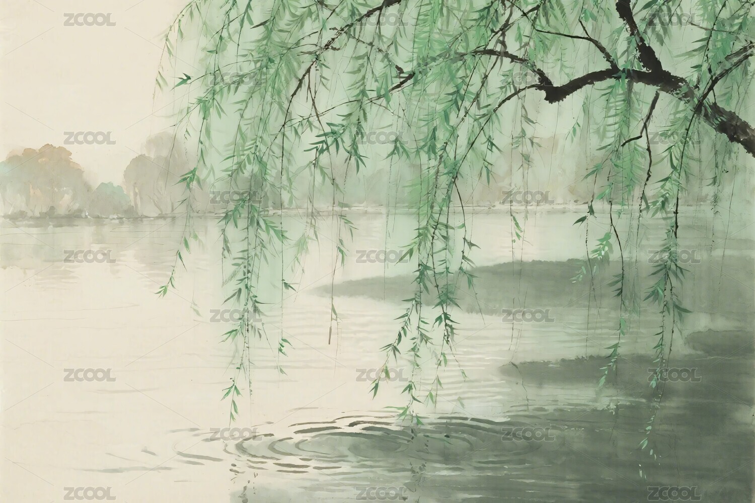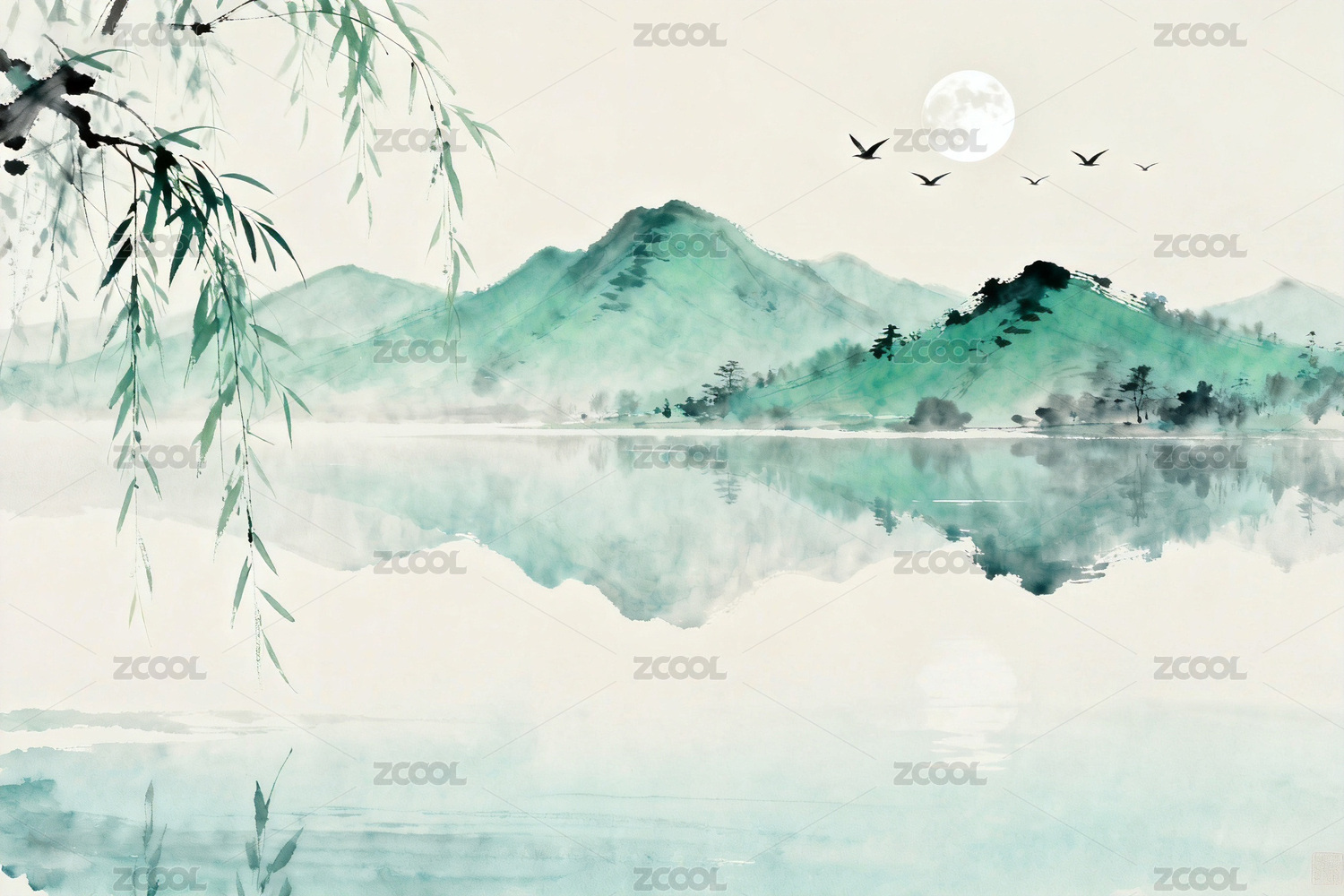 山水,飞鸟,小船,柳树,红日,插画,自然,风景,中式,意境