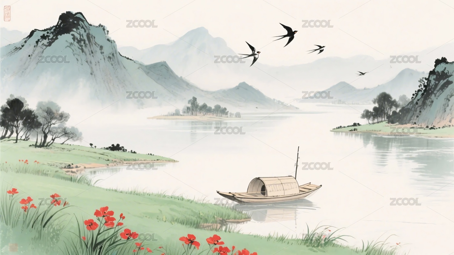 水墨山水间的孤舟红树