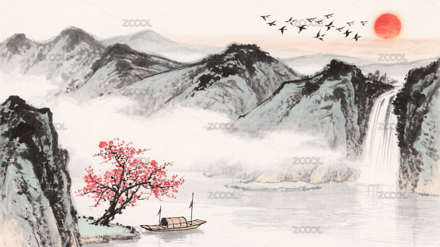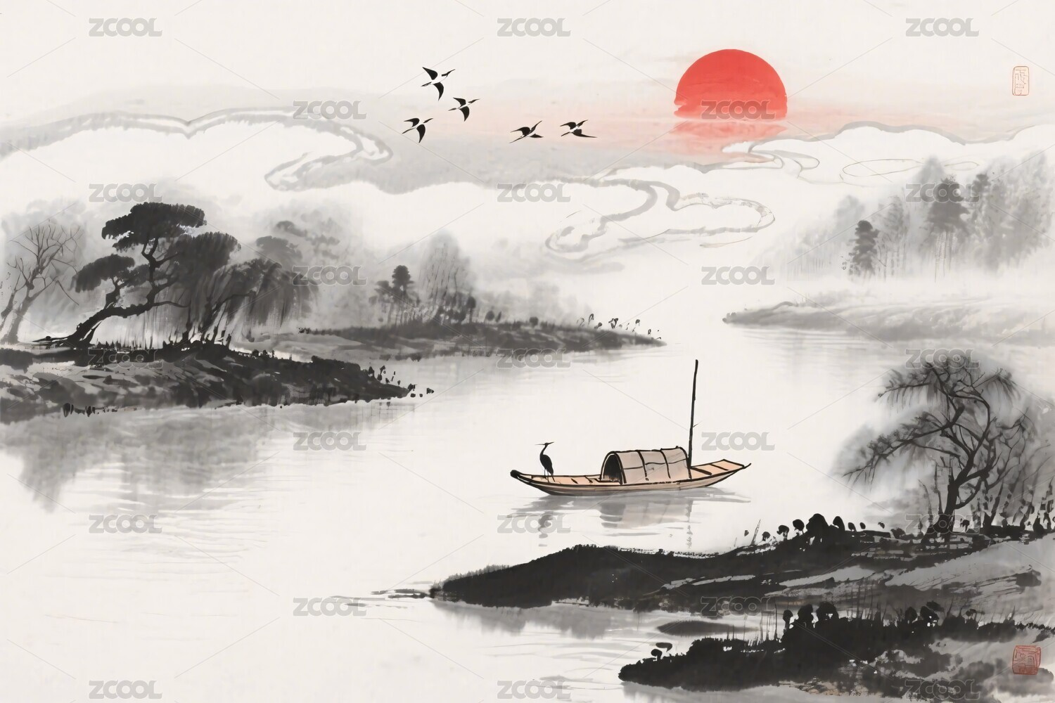 水墨山水间的孤舟飞鸟图
