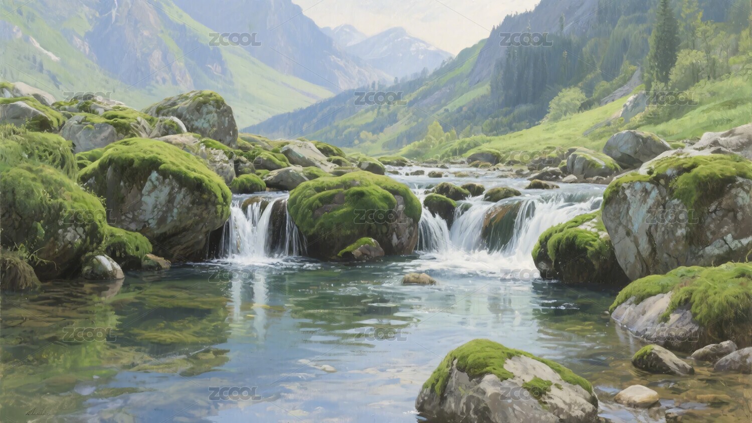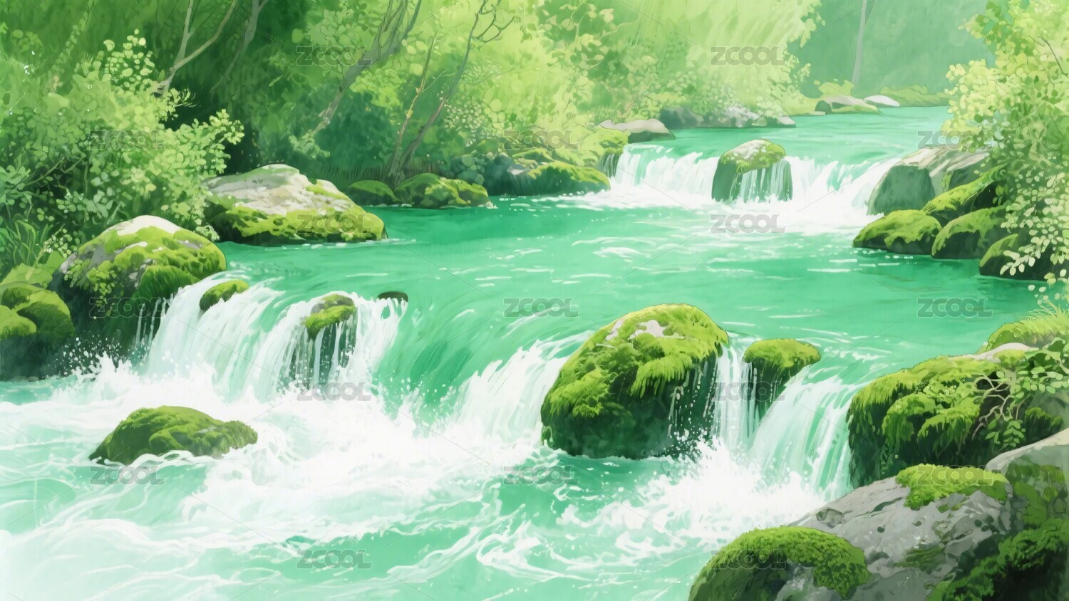 溪流,瀑布,山林,自然,美景,插画,绿色,山水,青苔,树木