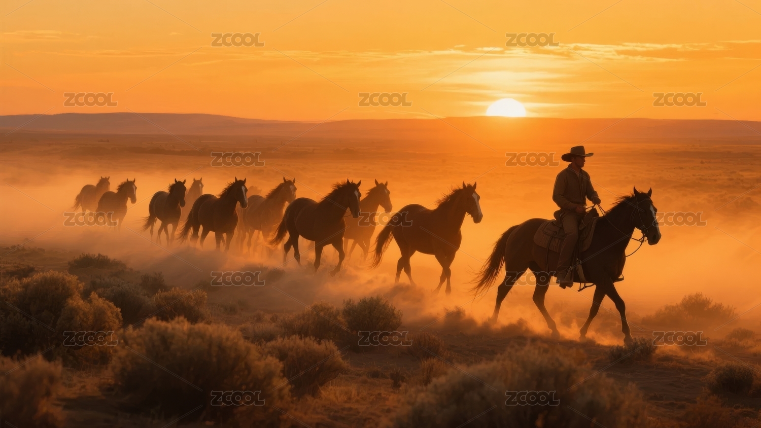 牛仔骑马,群马奔腾于夕阳下