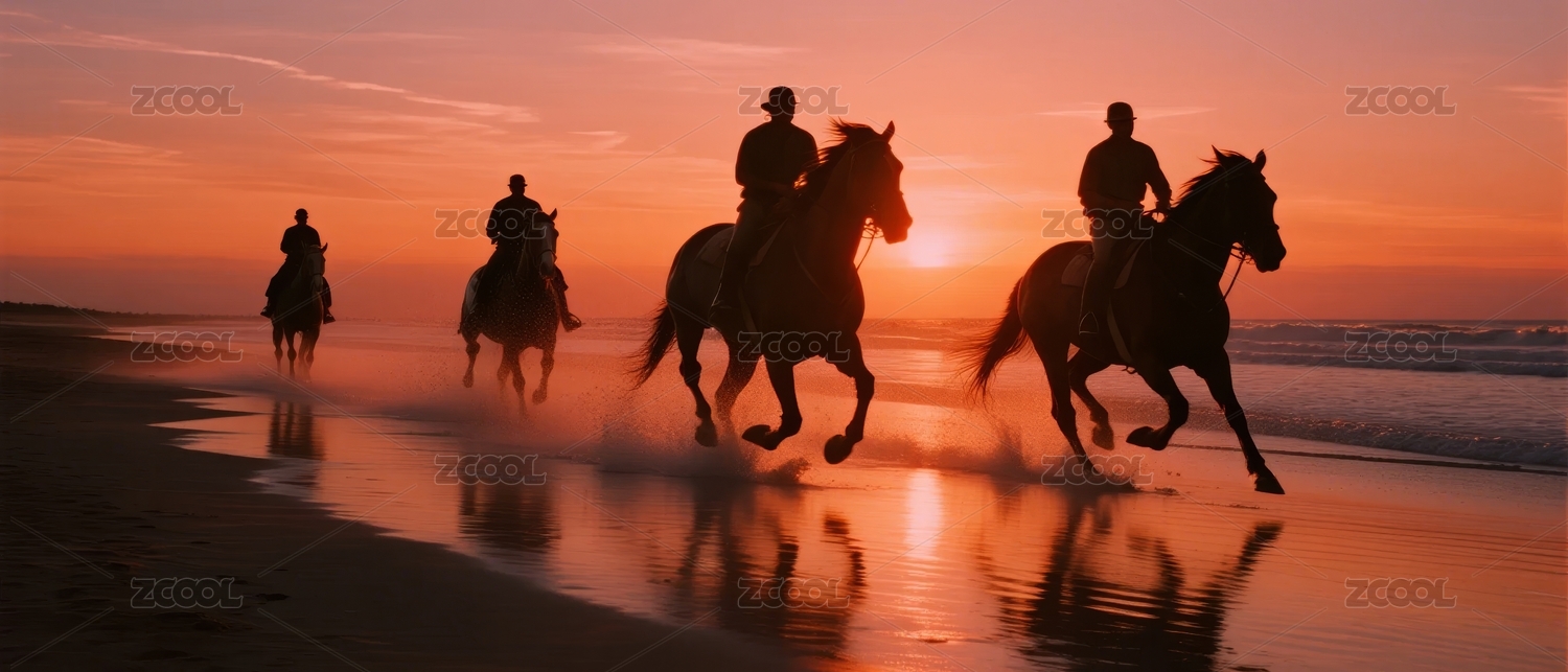 夕阳海滩上的骑马剪影