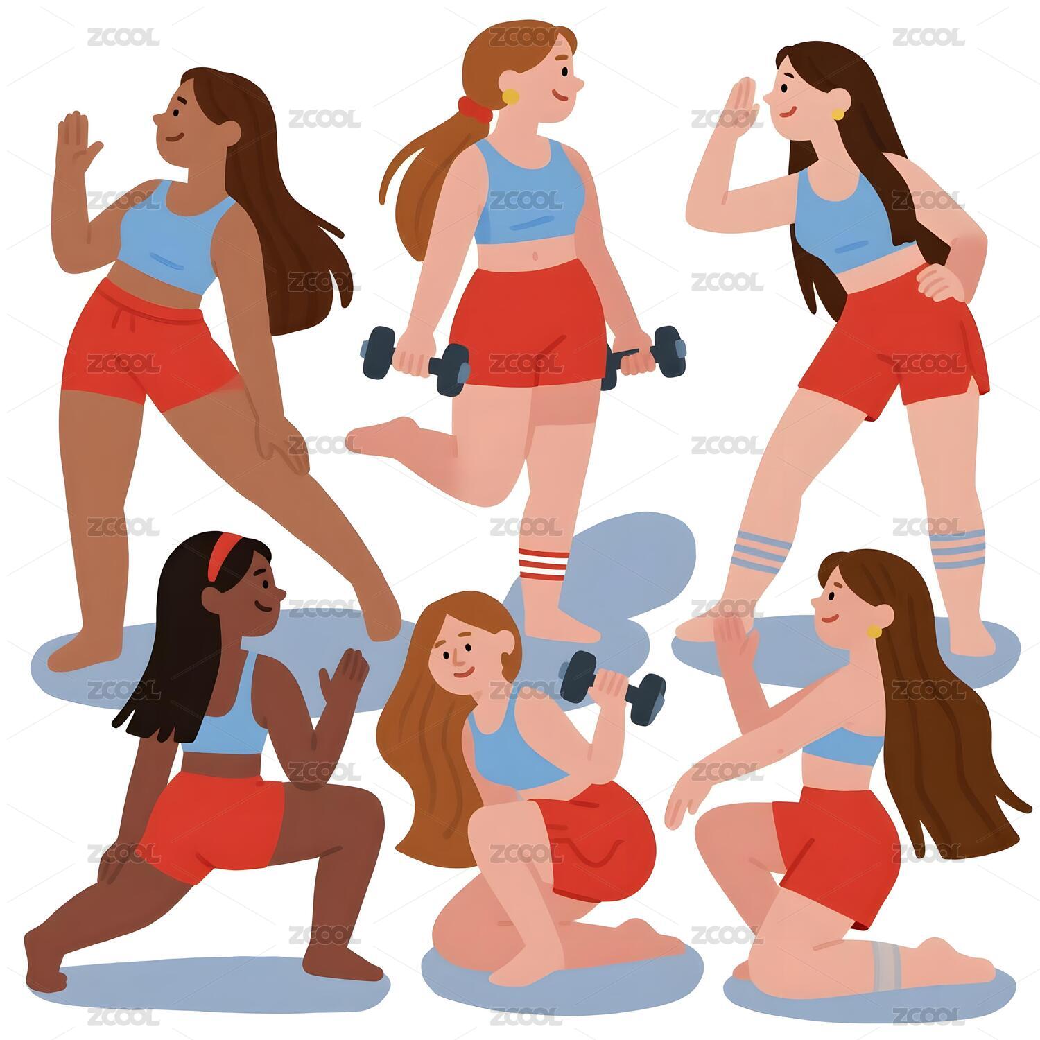女生健身房瑜伽锻炼健身球举重多人矢量图