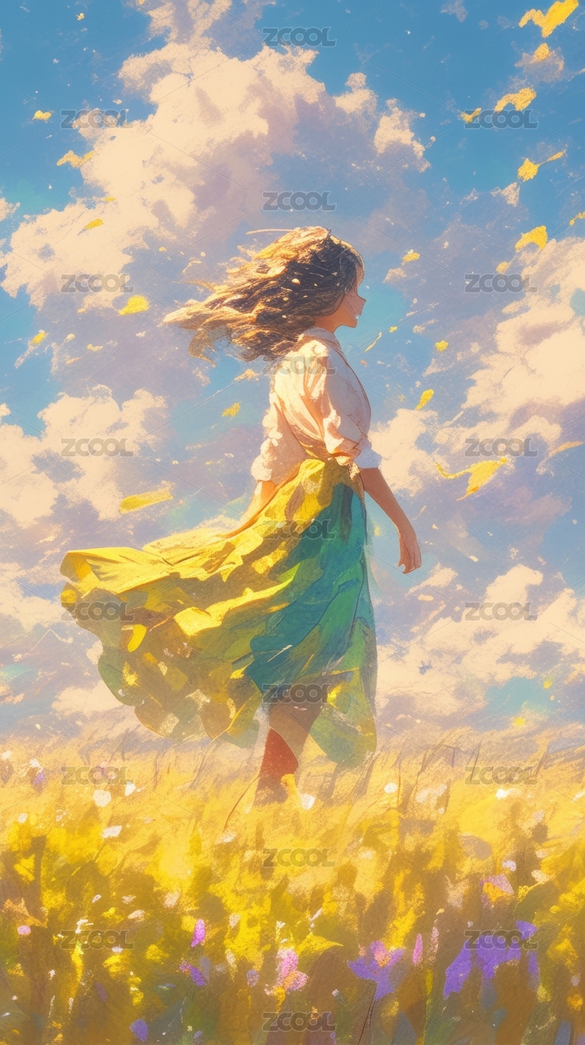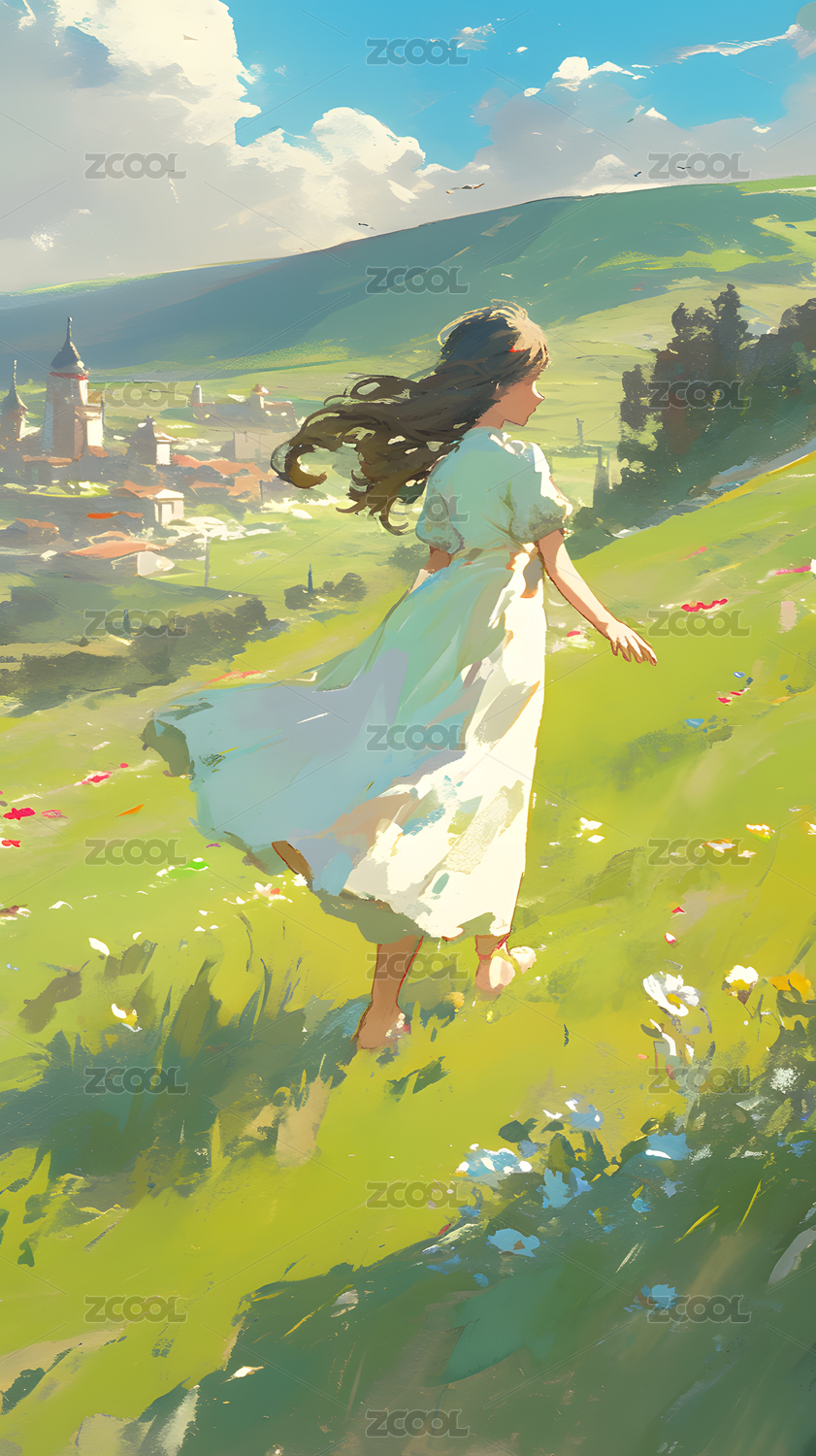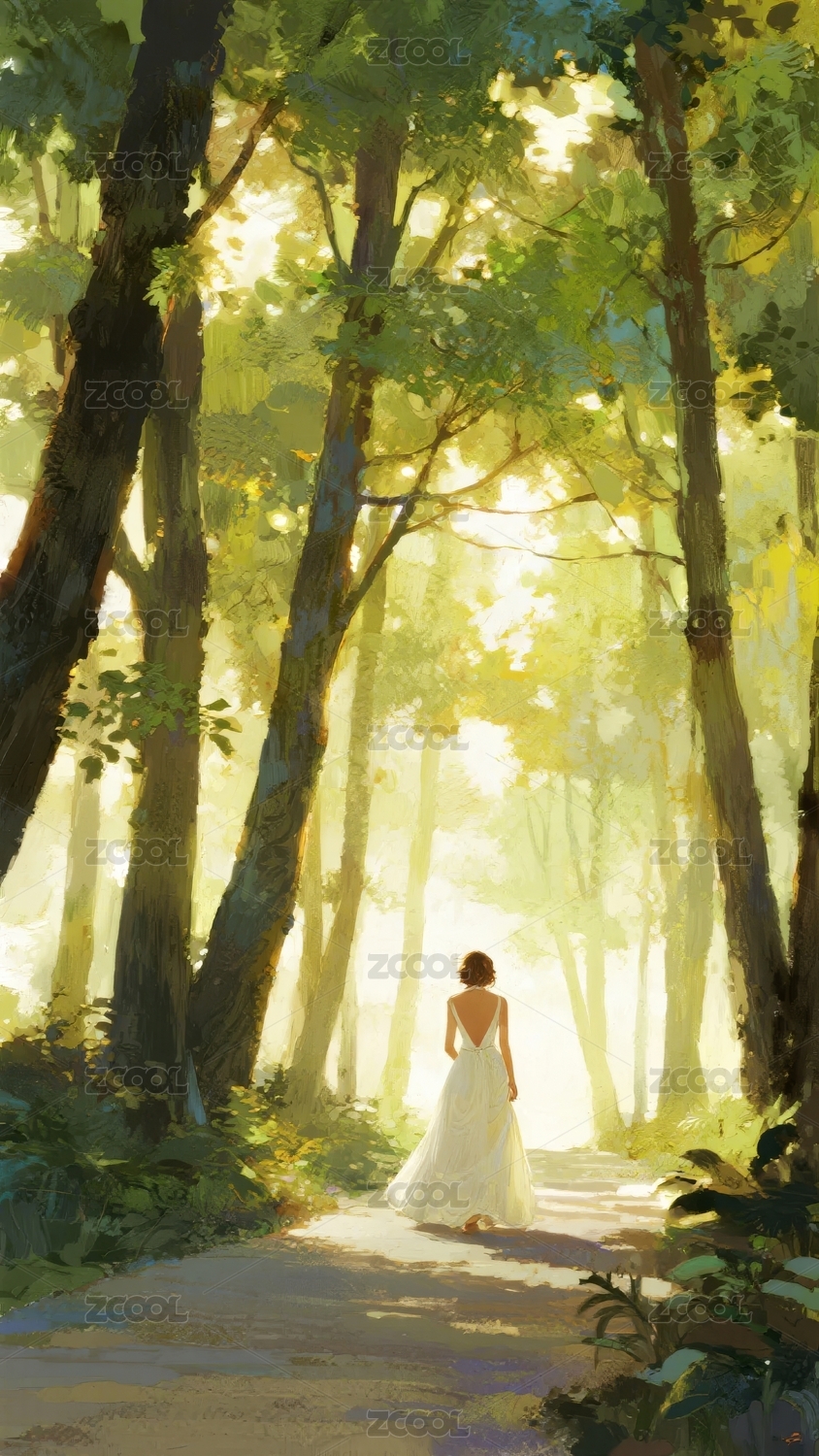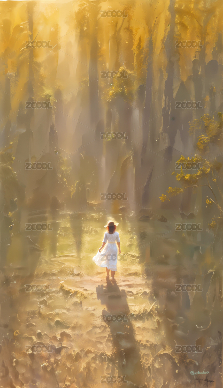 秋天一个穿白裙子的女孩在森林中漫步油画