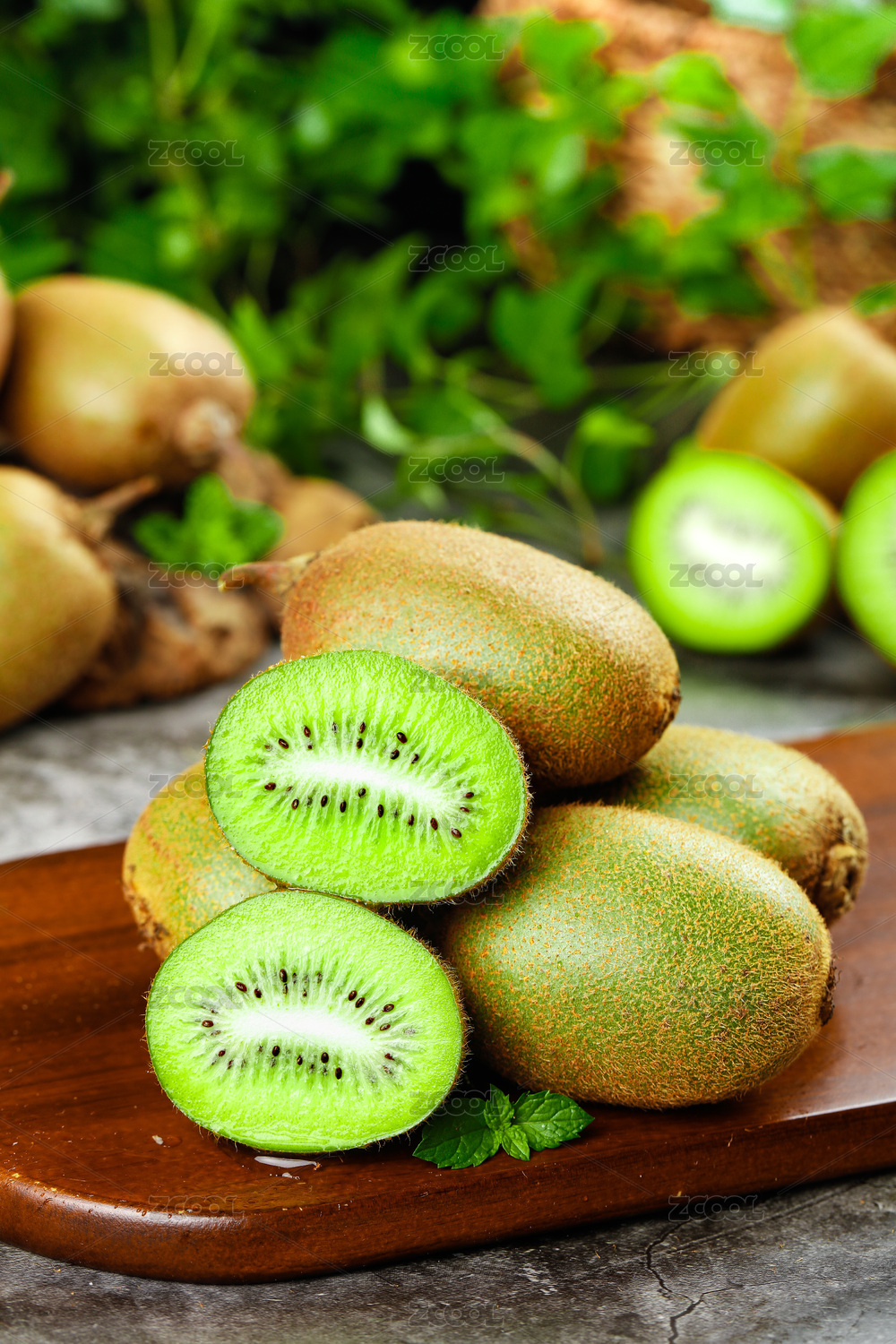 大理石底上放着一个猕猴桃和半边绿心猕猴桃