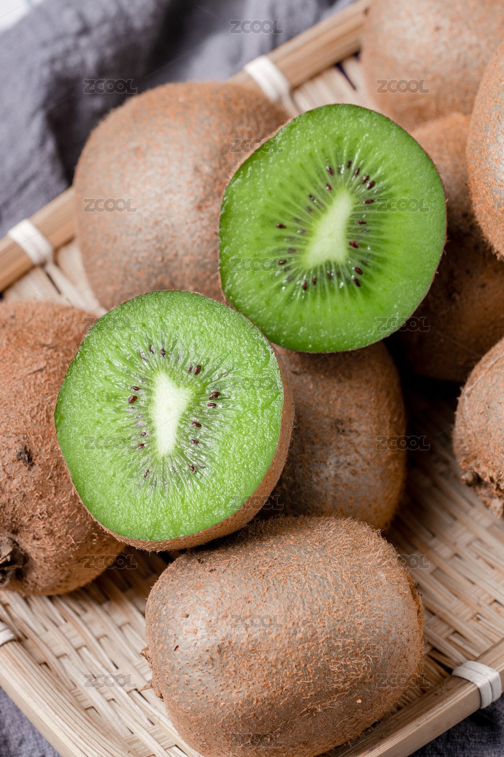 放在圆形木盘子上的新鲜绿心猕猴桃