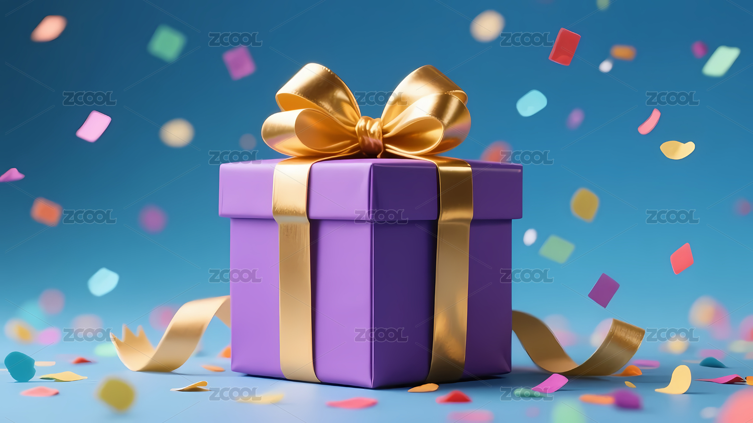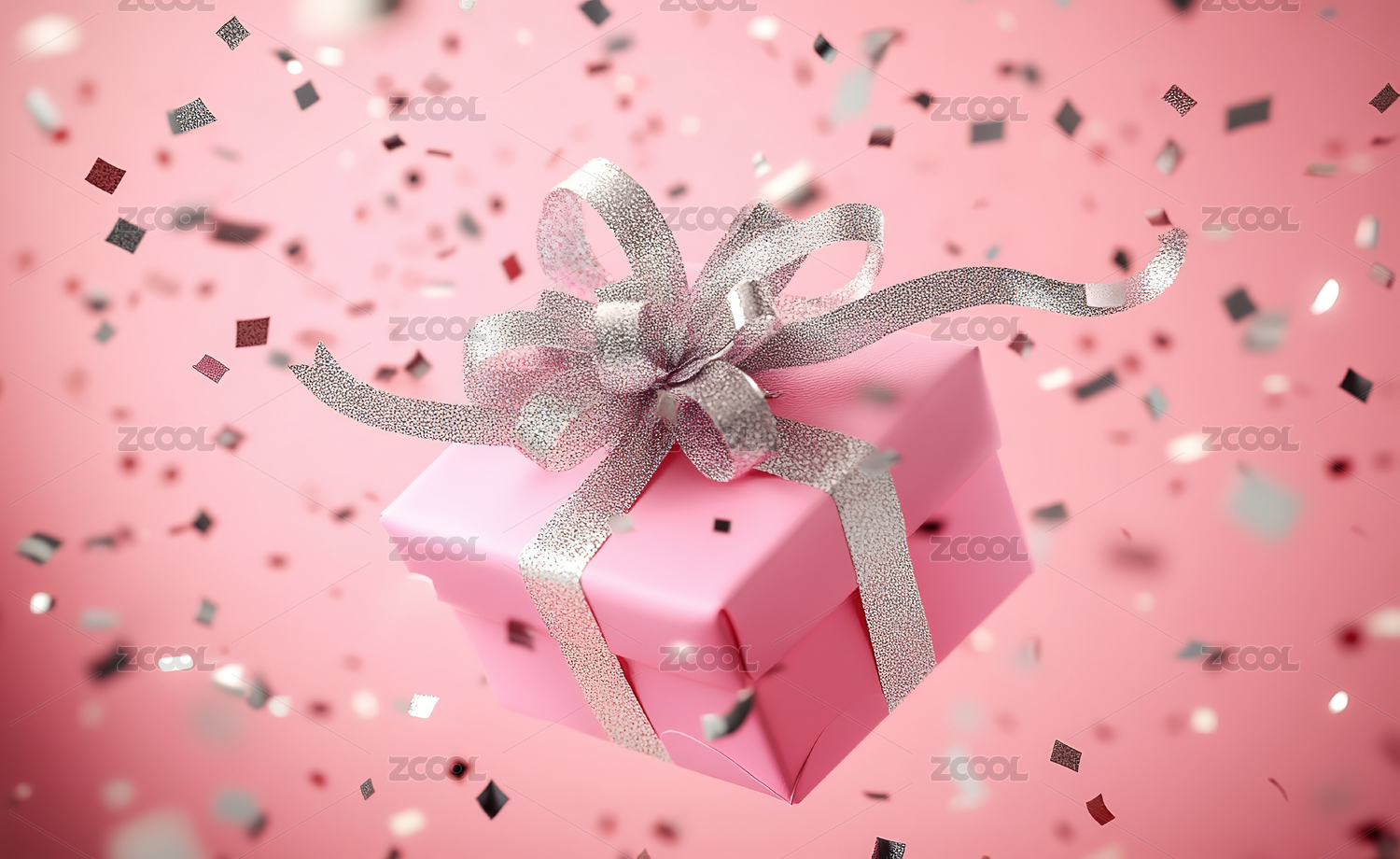 粉色礼盒与蓝色蝴蝶结和缤纷纸屑