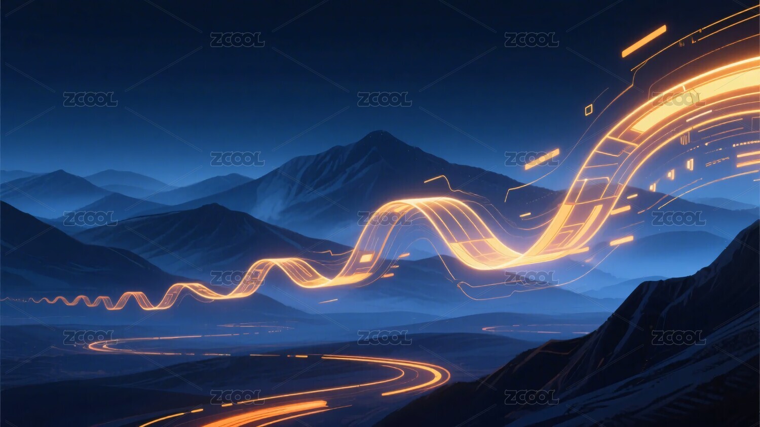 公路,山脉,夜景,光影,线条,色彩,自然,风景,插画,矢量
