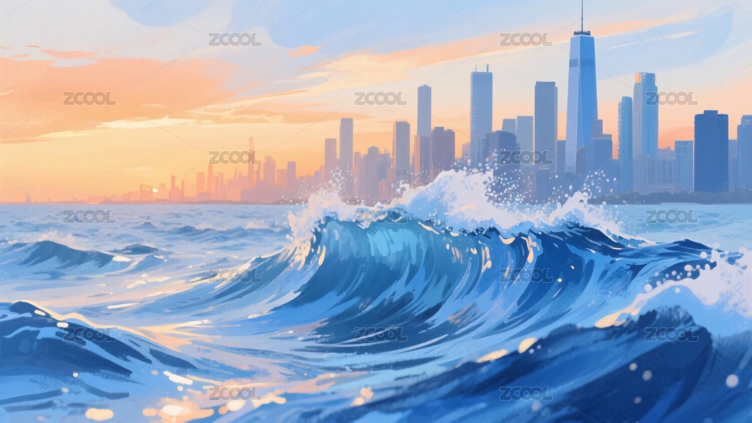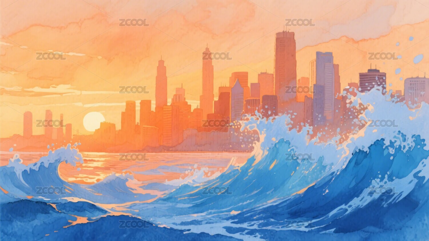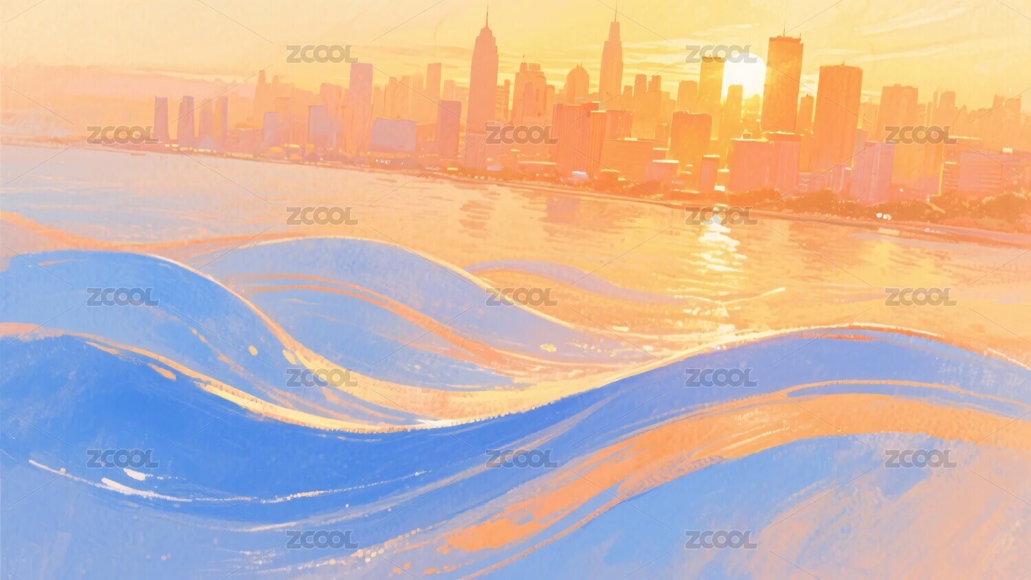 海浪,城市,天际线,插画,夕阳,建筑,蓝色,橙色,画面元素,风景