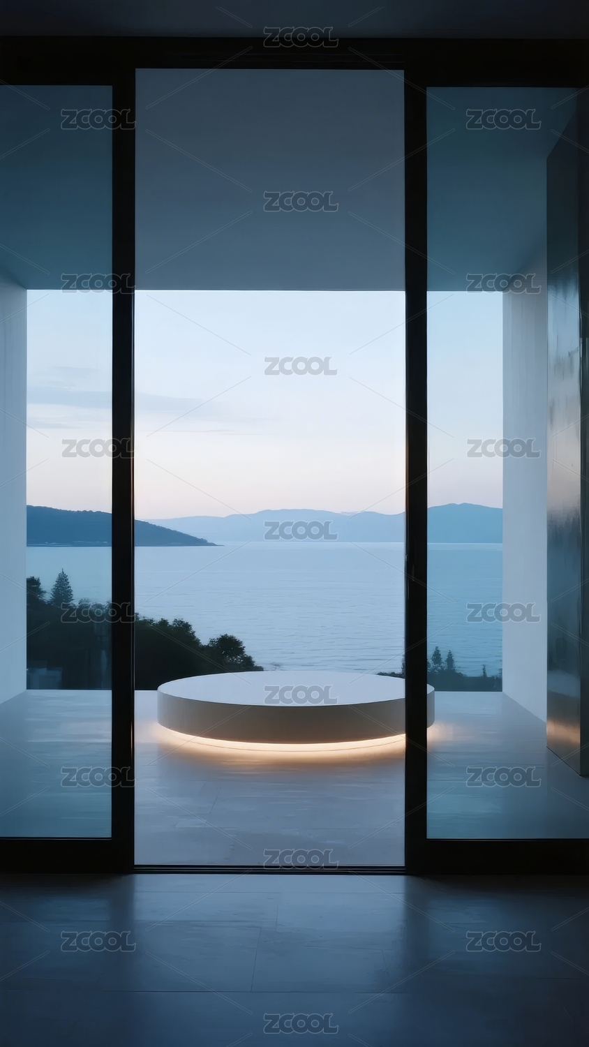 自然景观,透明材质,环境融合,简约风格,室内设计,灯光效果,现代建筑,圆形灯饰,海景视野,玻璃幕墙