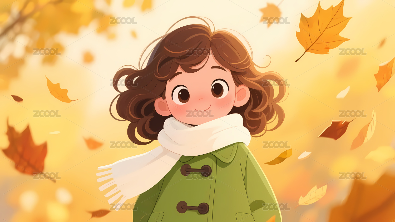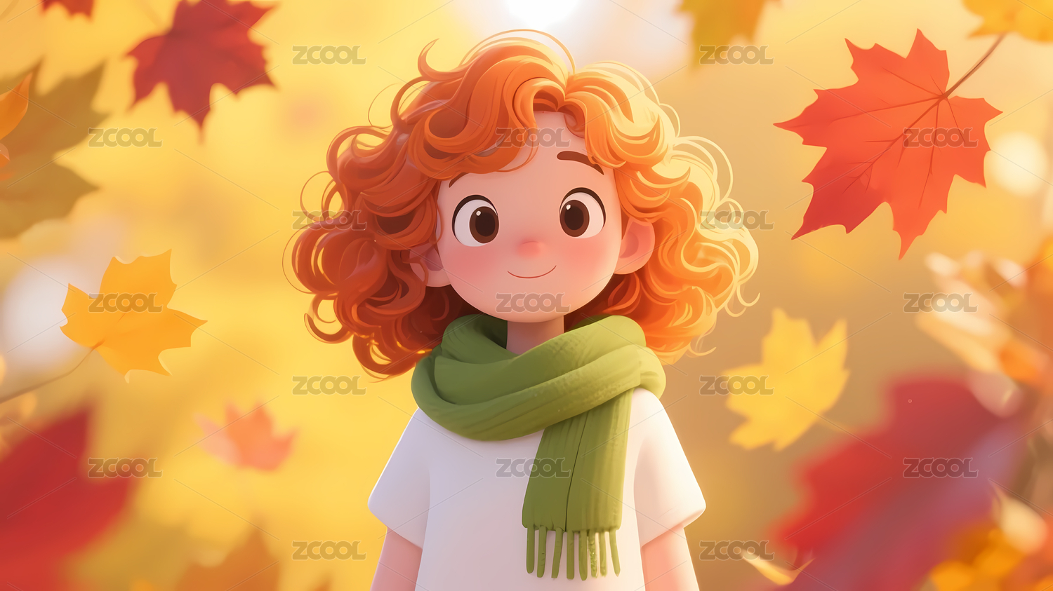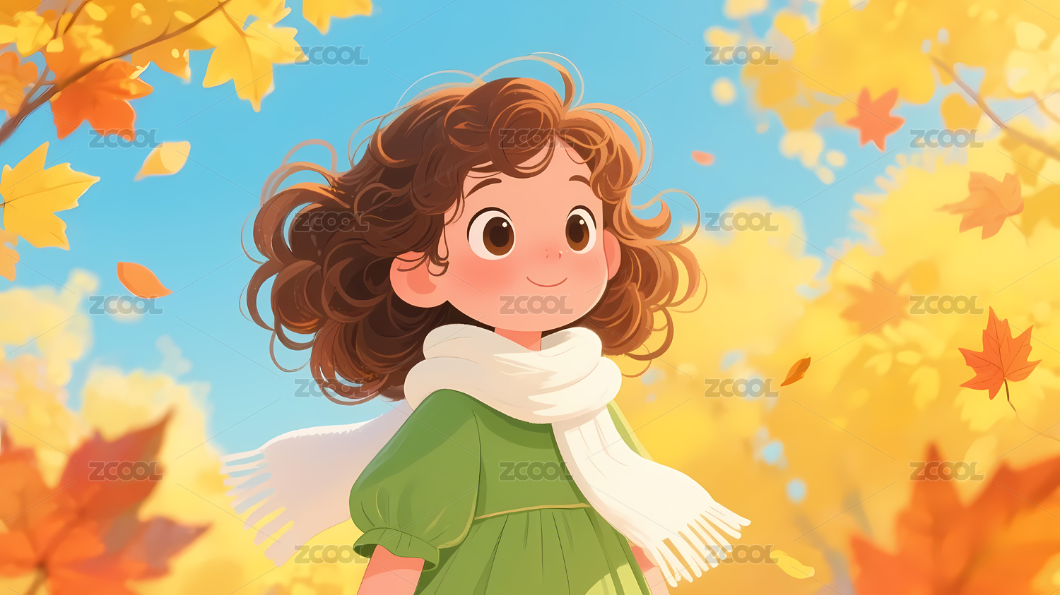 插画,背景,3D,女孩,场景,梧桐树叶,树叶,秋天,秋季,壁纸