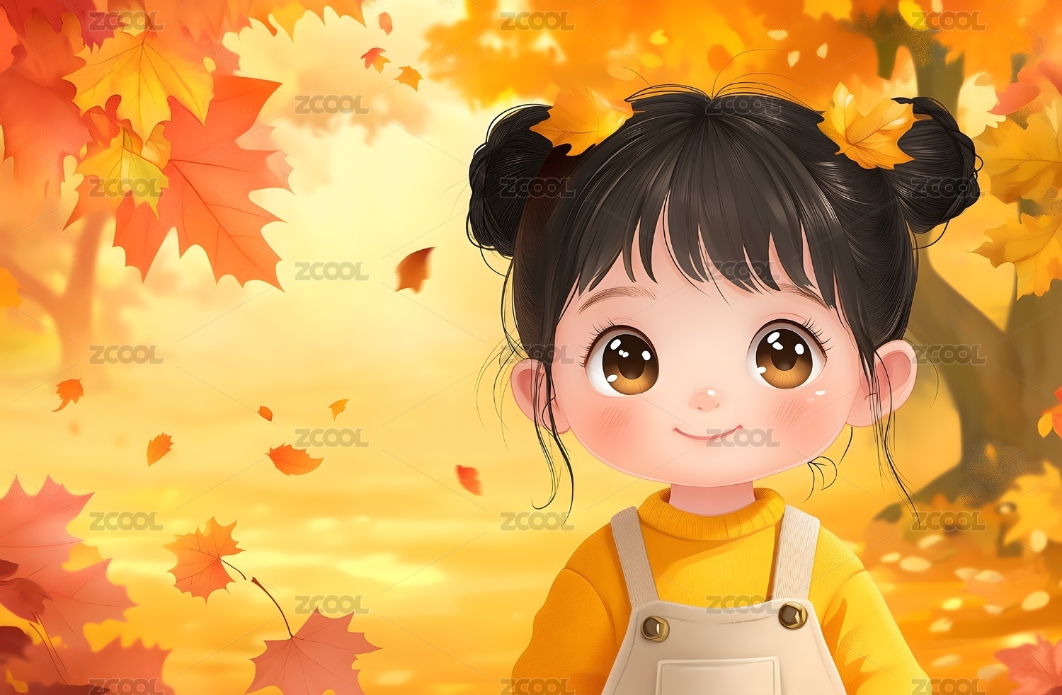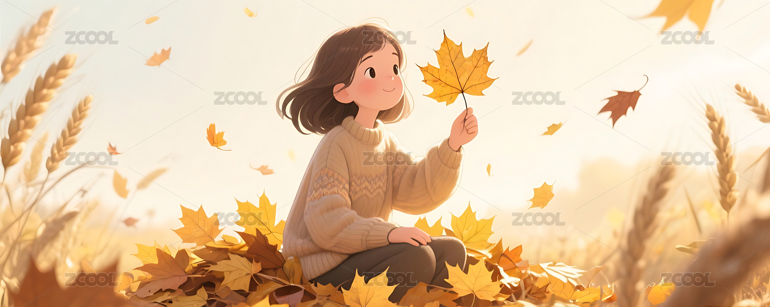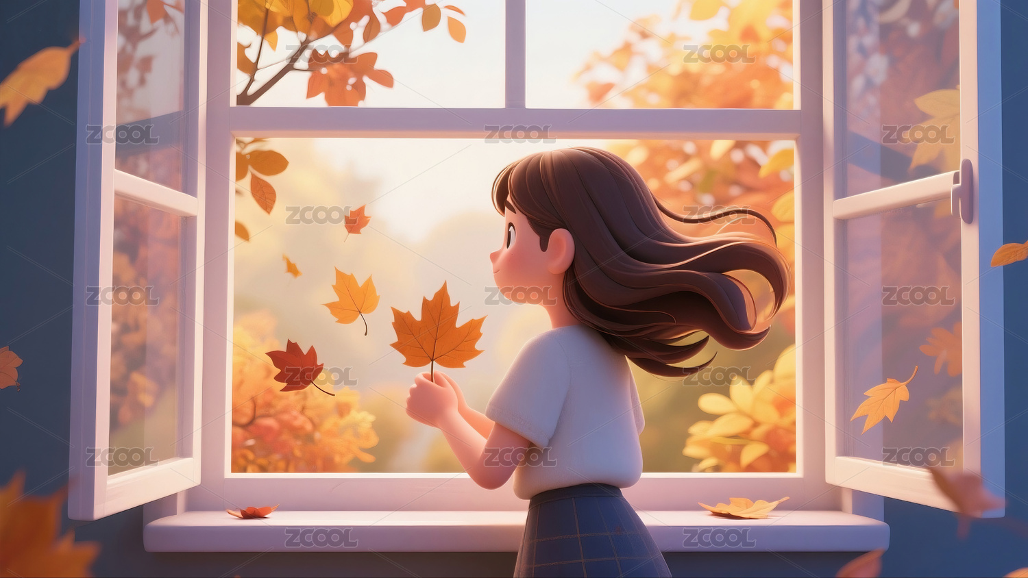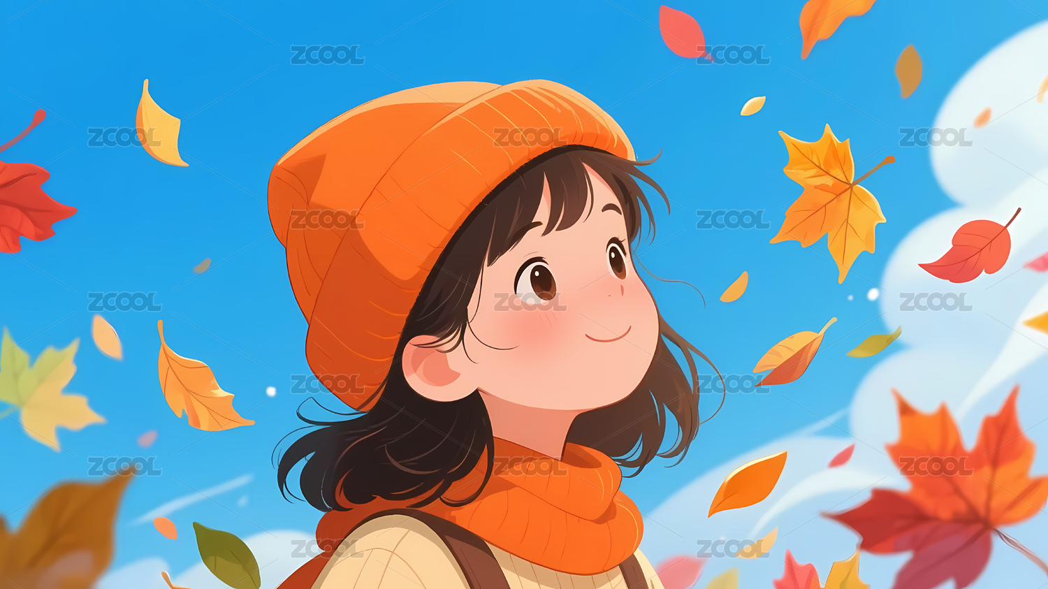 插画,背景,3D,女孩,场景,梧桐树叶,树叶,秋天,秋季,壁纸