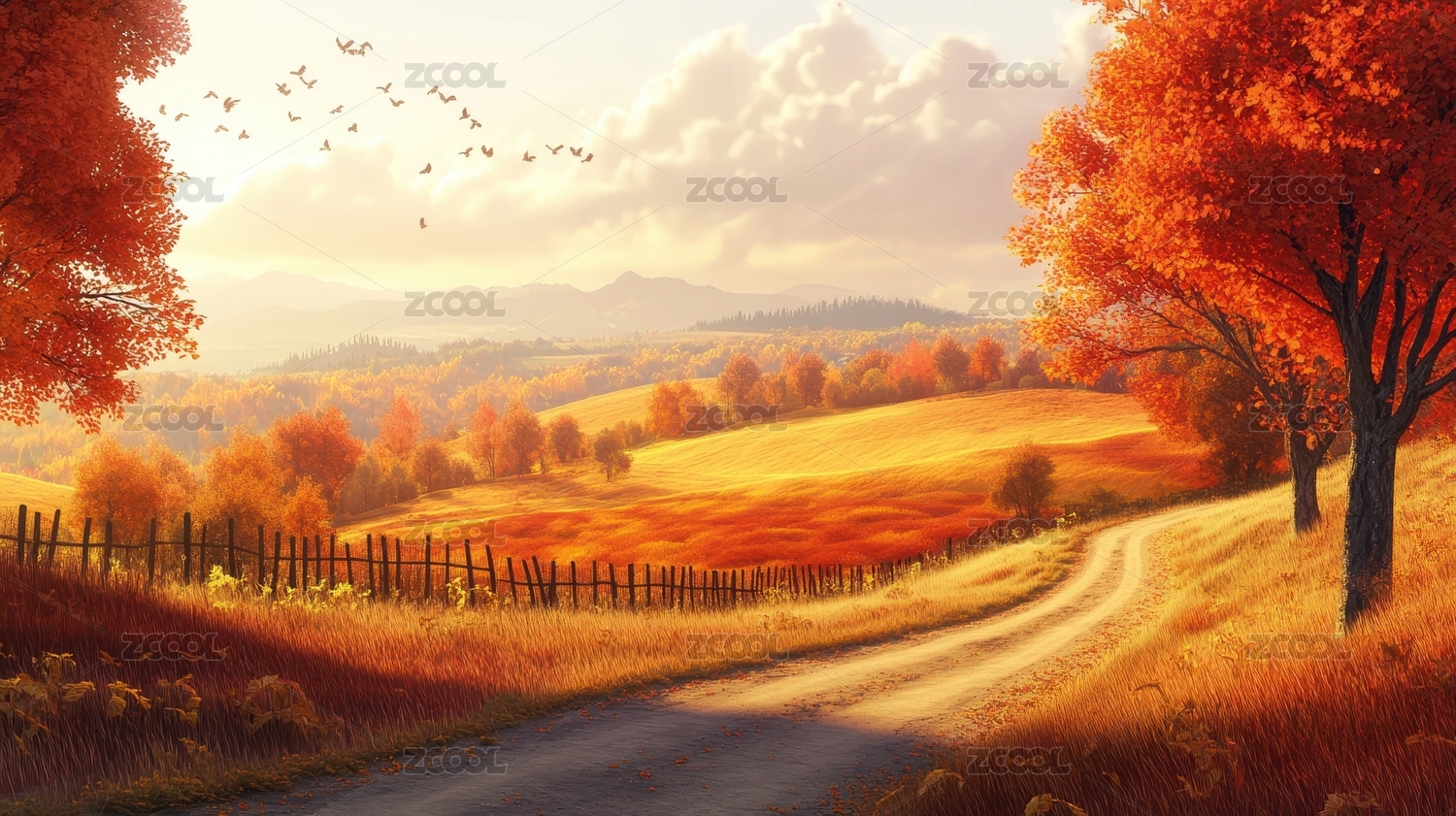 背景,壁纸,插画,秋天,树林,黄色,落日,公路,道路,落叶