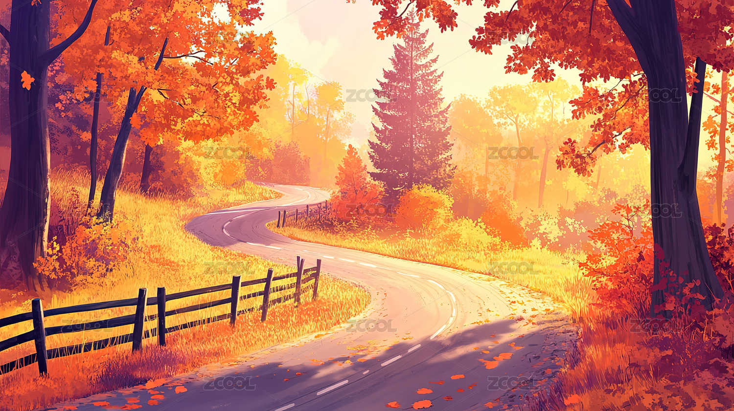 背景,壁纸,插画,秋天,树林,黄色,落日,公路,道路,落叶