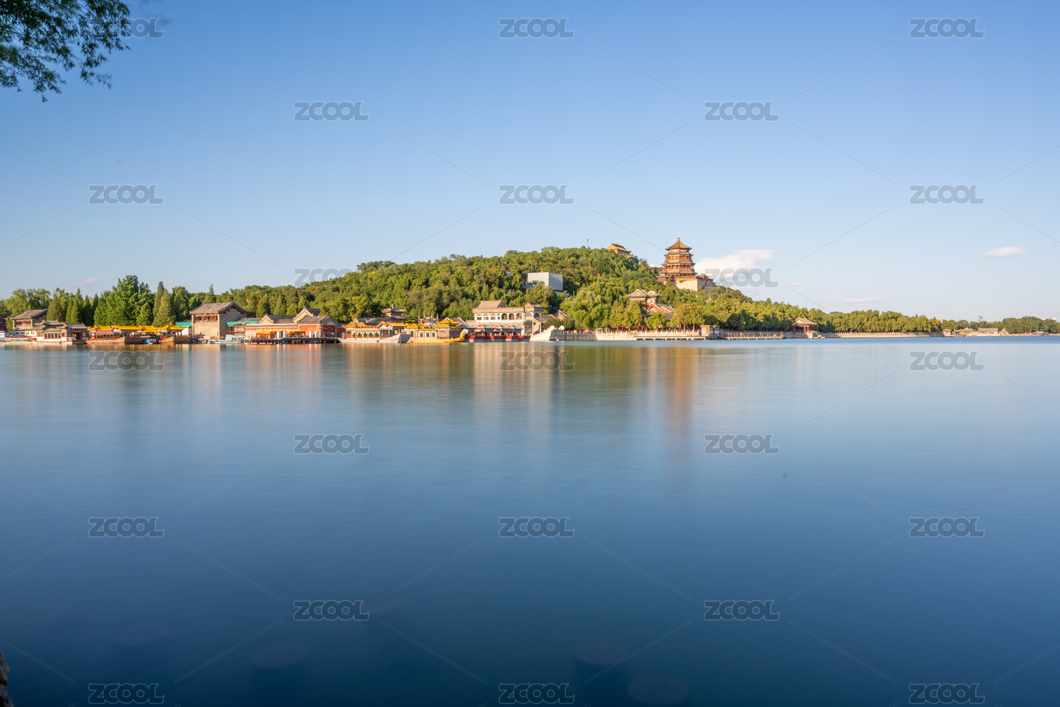 清晨阳光下的颐和园凤凰墩与远处的佛香阁