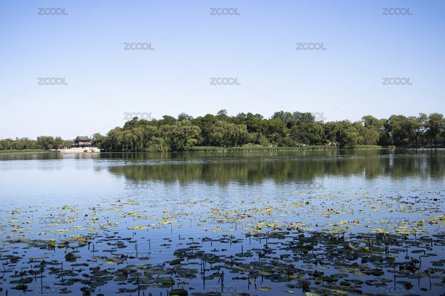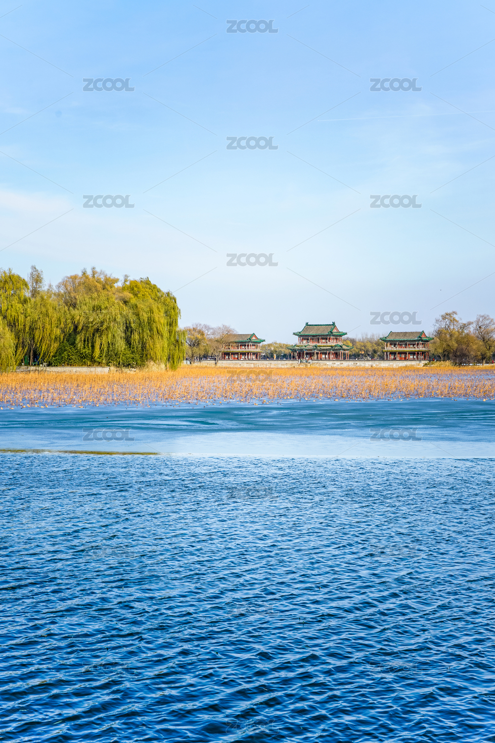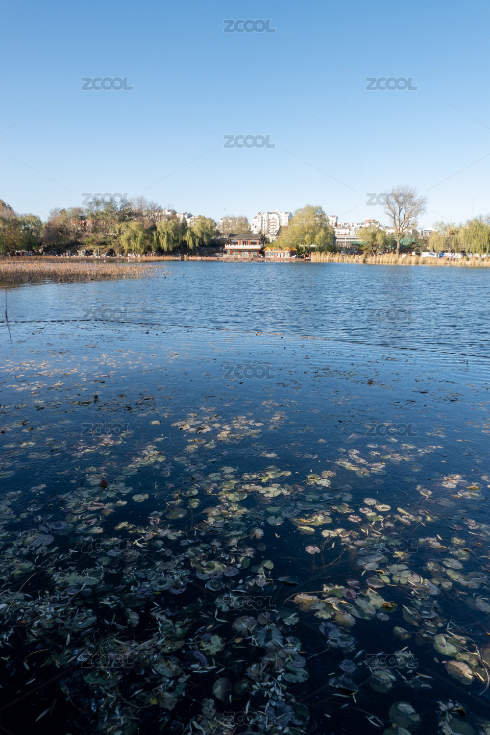 初冬时节碧空映衬下的北京什刹海后海景区风