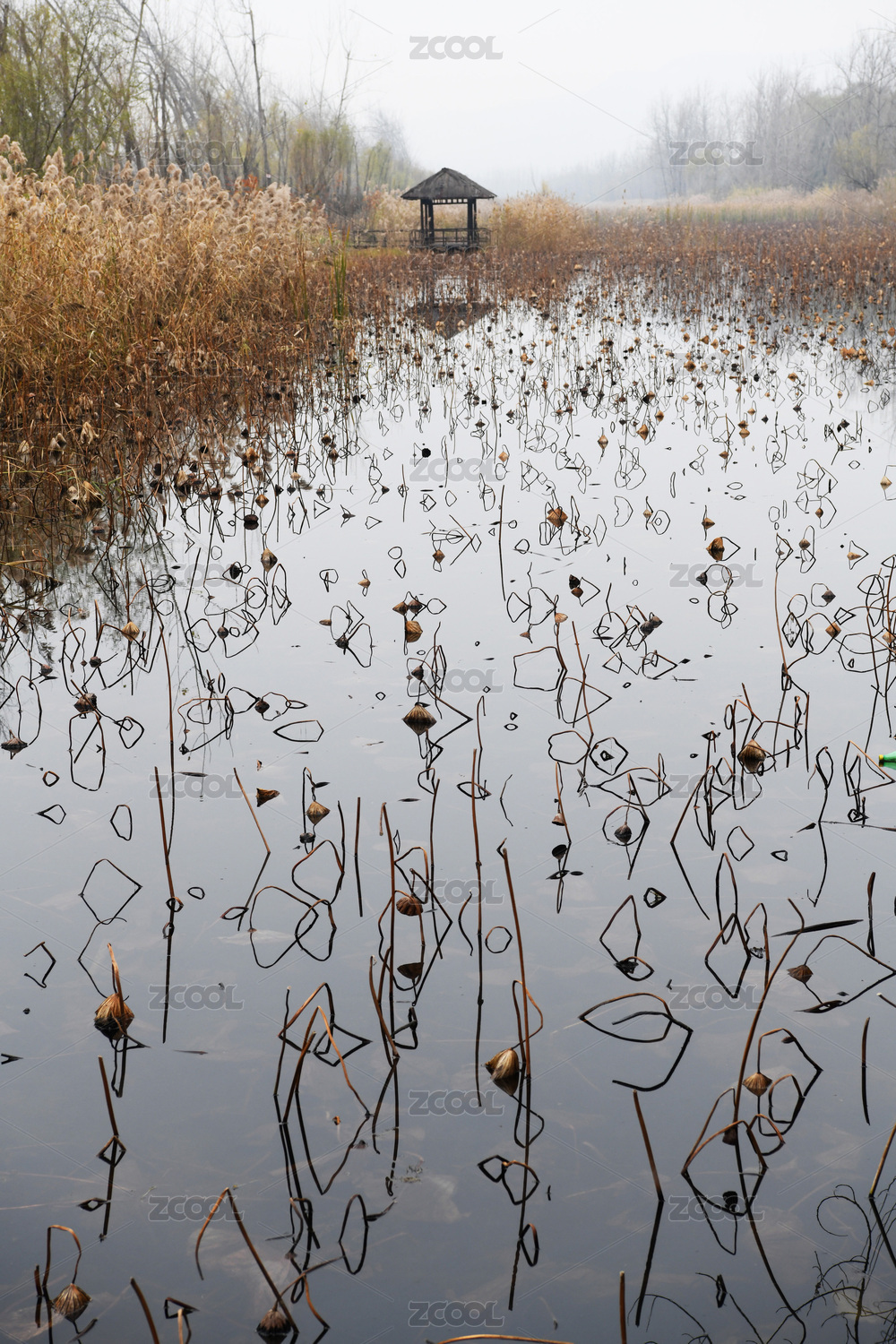 中国山东枣庄滕州市微山湖红荷湿地残荷疏影