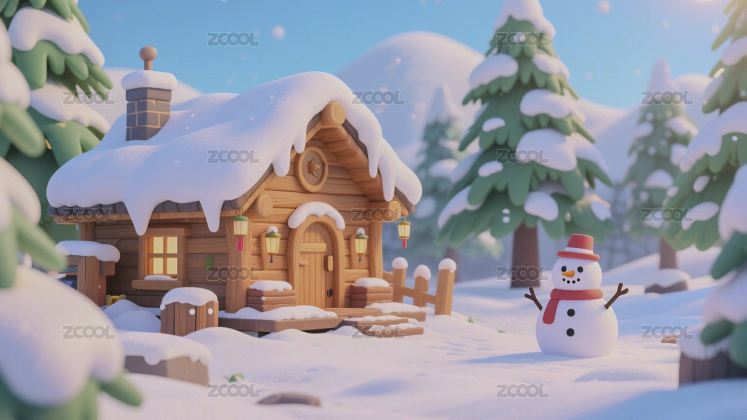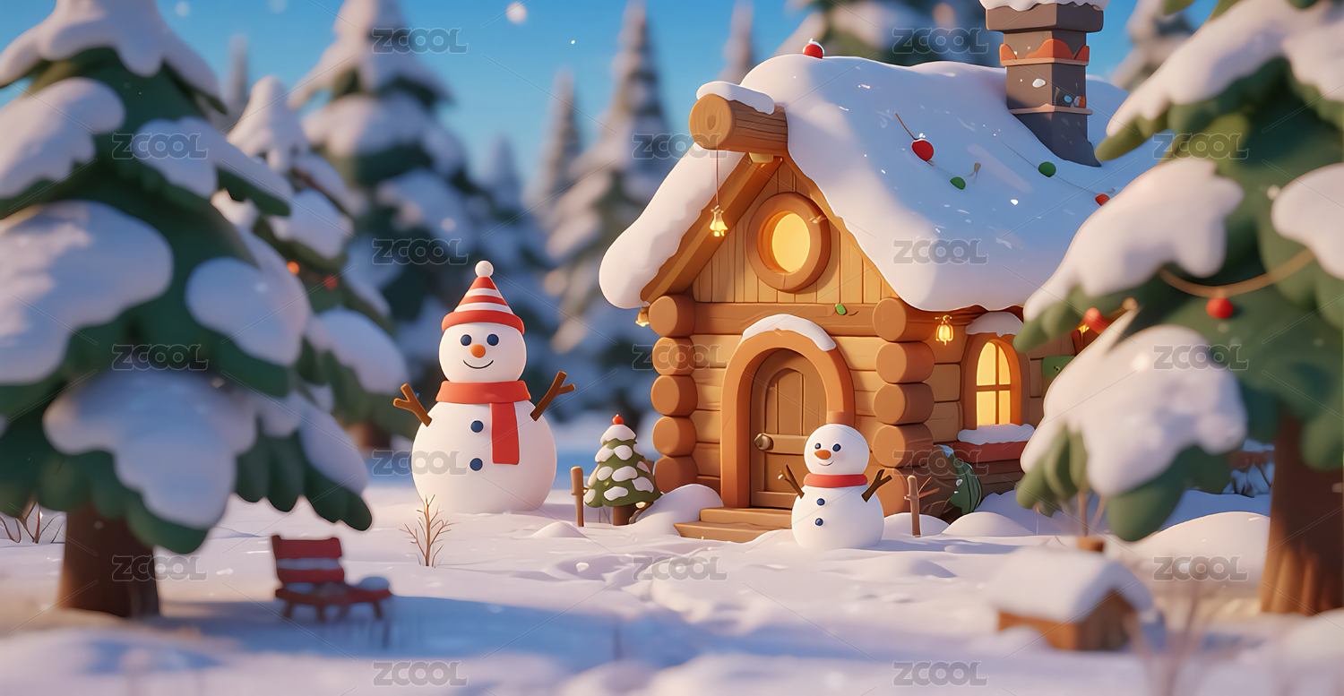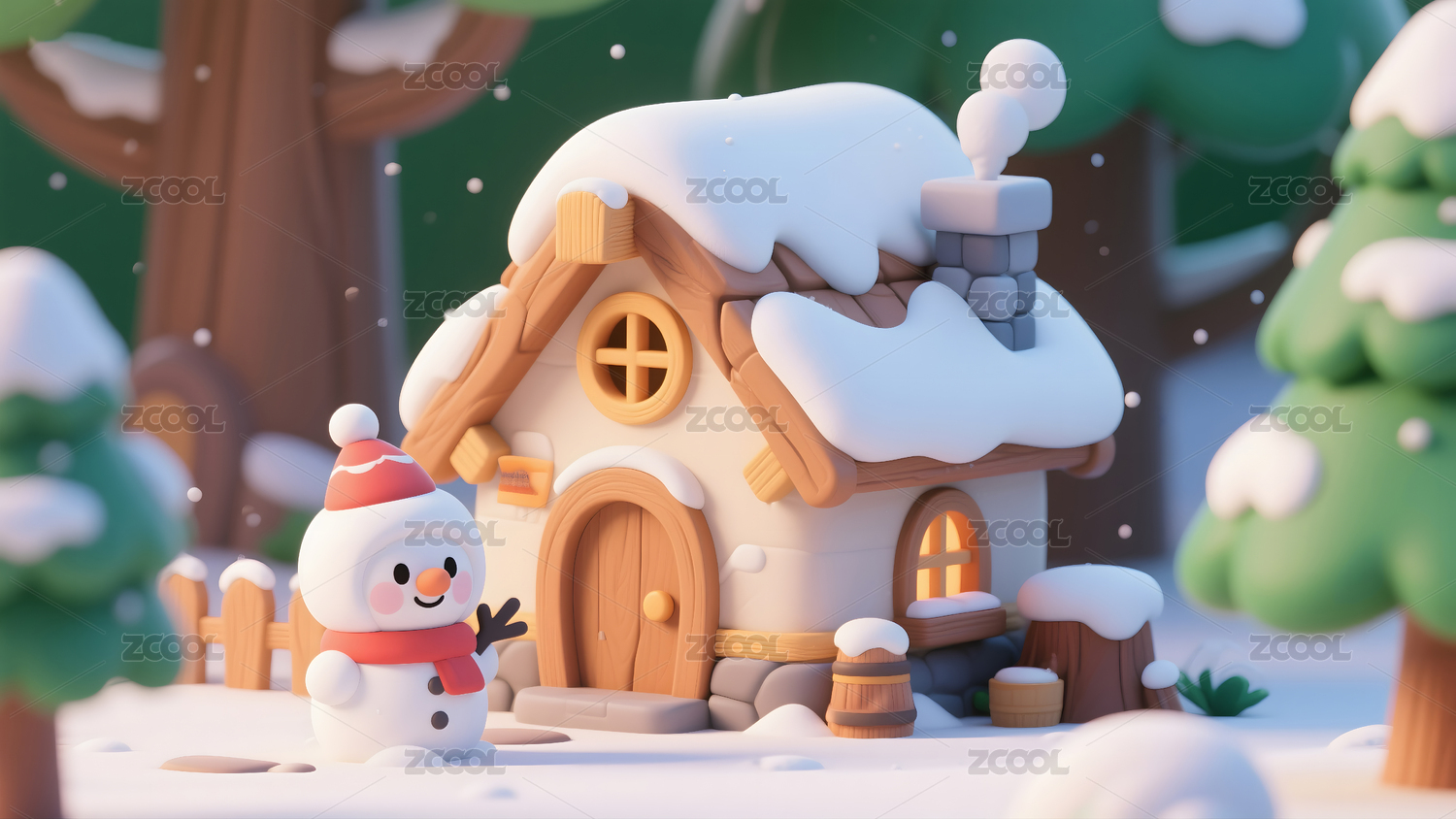 雪人,小屋,冬季,雪景,童话,卡通,房子,烟囱,积雪,树木