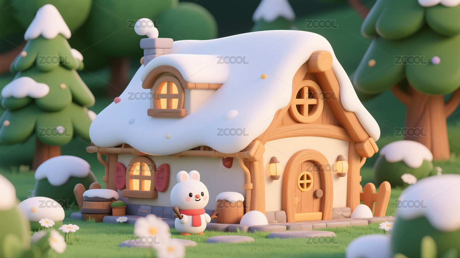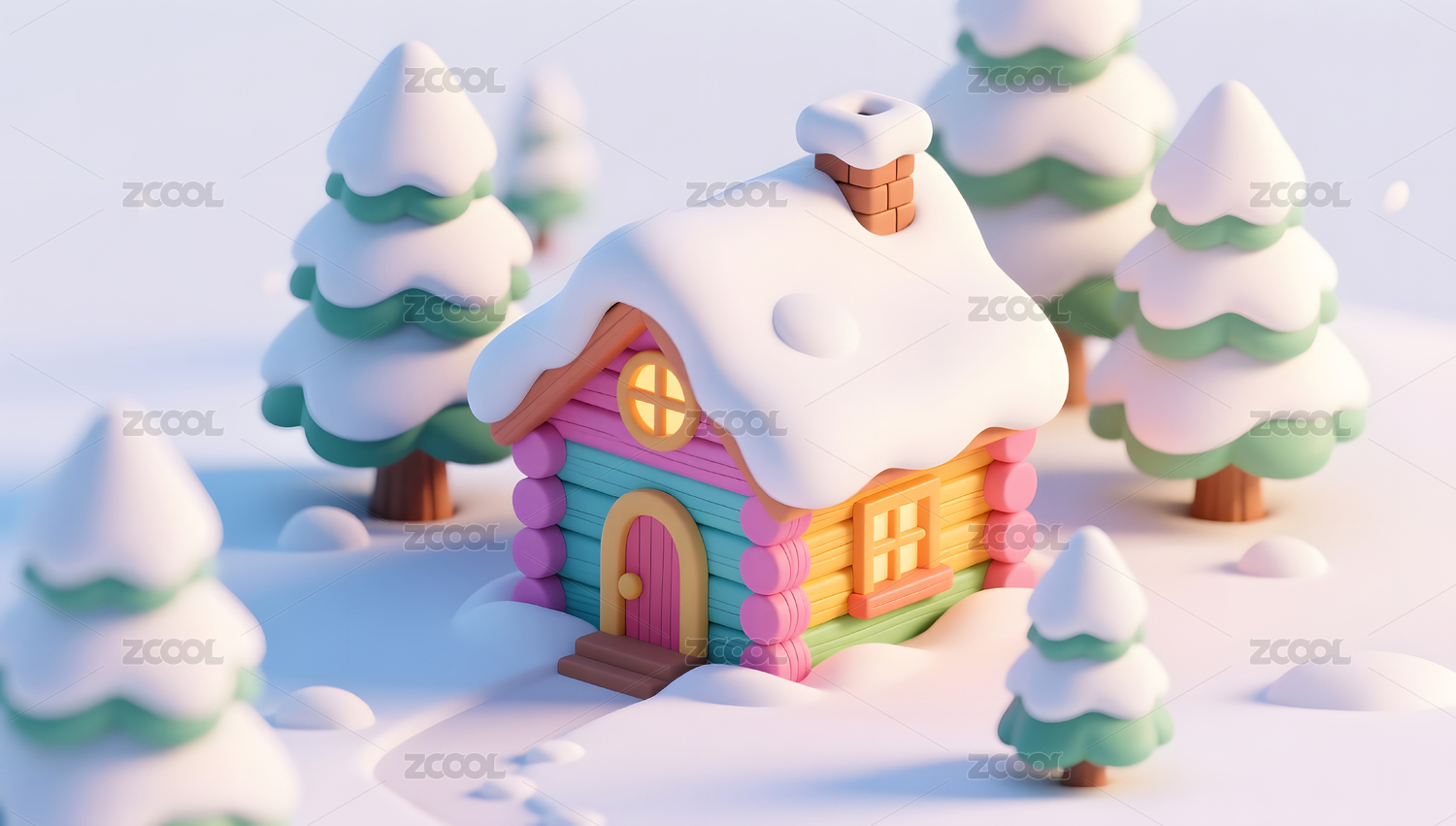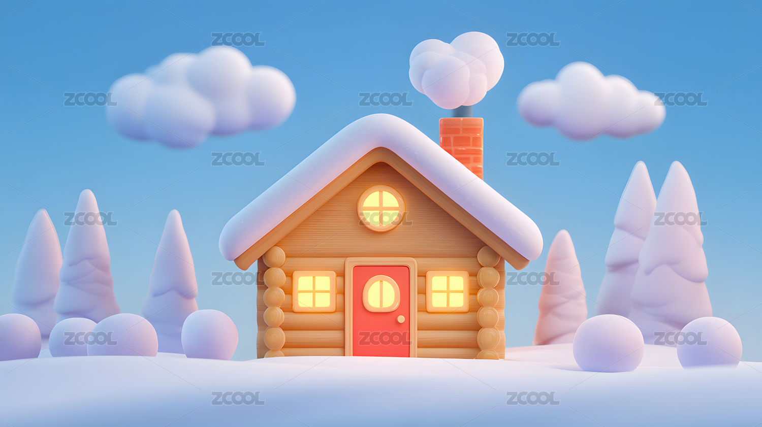 雪人,小屋,冬季,雪景,童话,卡通,房子,烟囱,积雪,树木