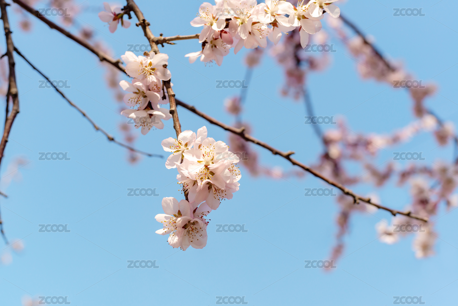 蓝天下阳光中盛开的的颐和园西堤桃花