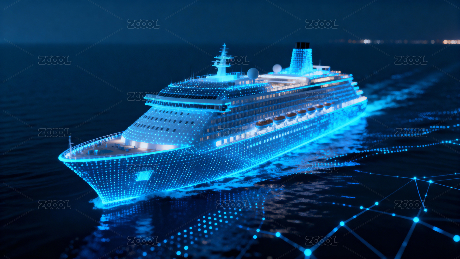 夜海发光邮轮航行景象