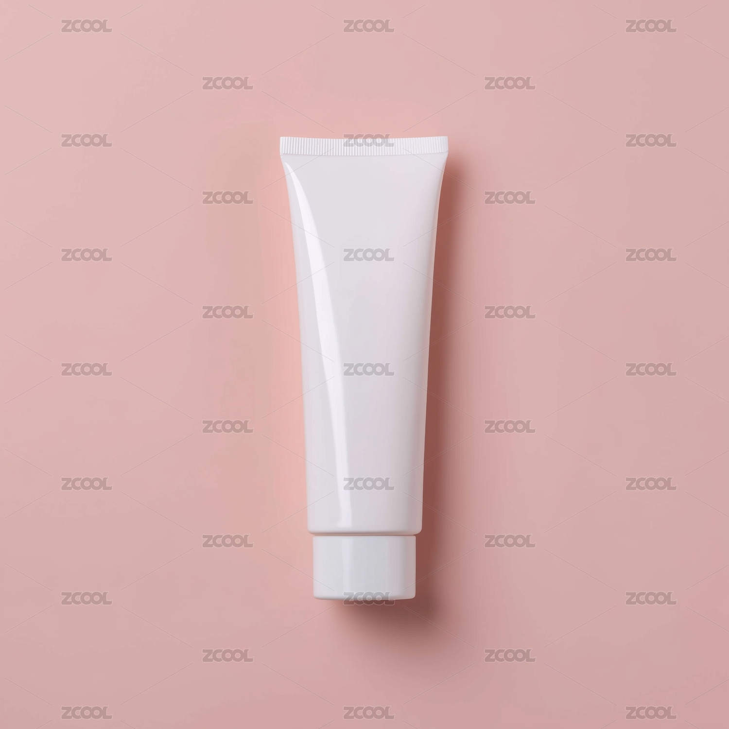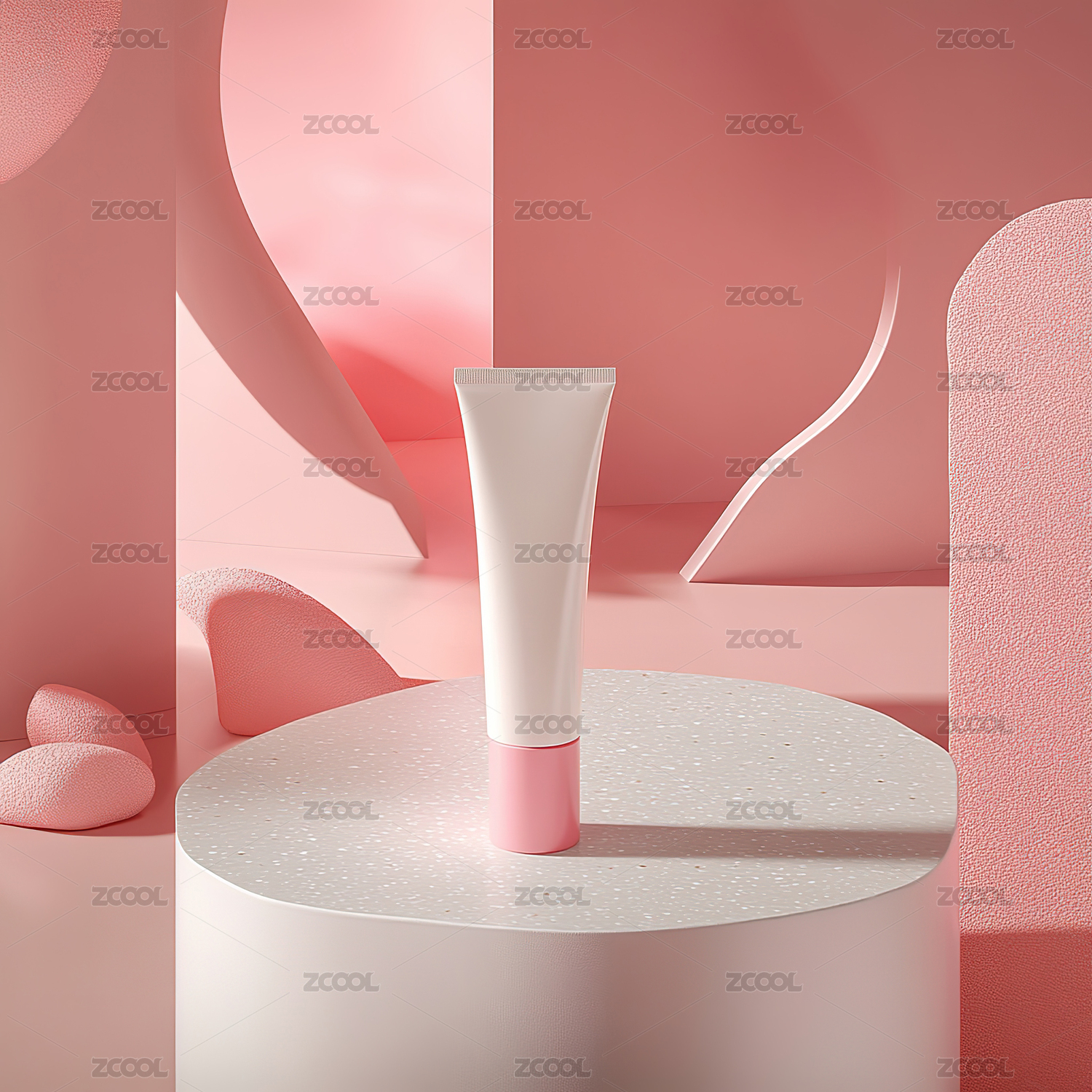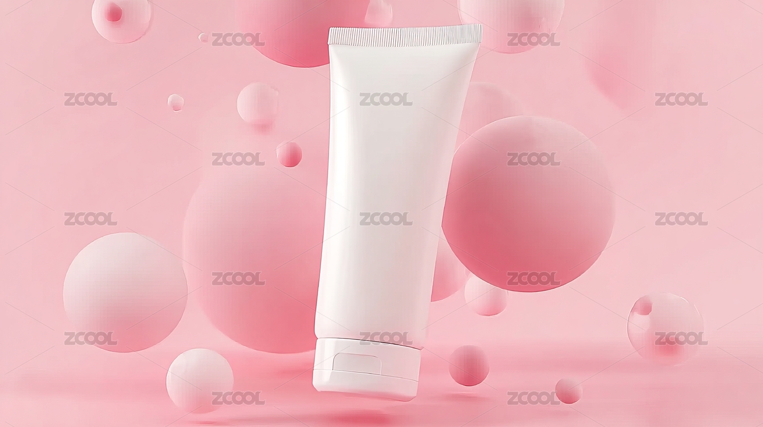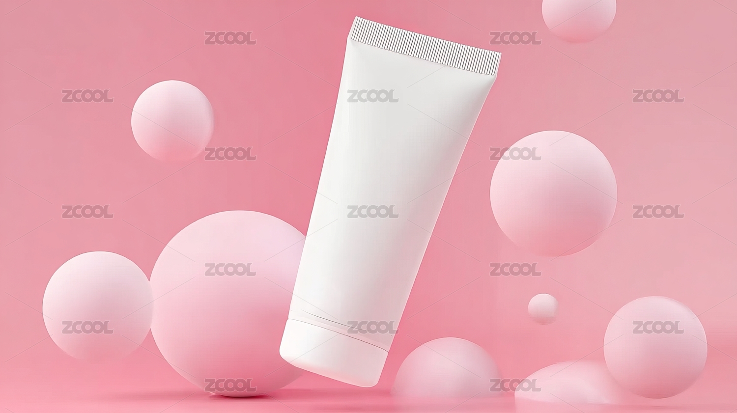 粉色背景下的白色管状化妆品与粉色球体装饰