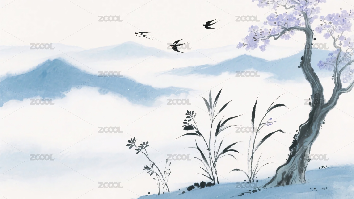 山水,紫花,插画,自然,风景,水墨画,花鸟,中式,元素,意境
