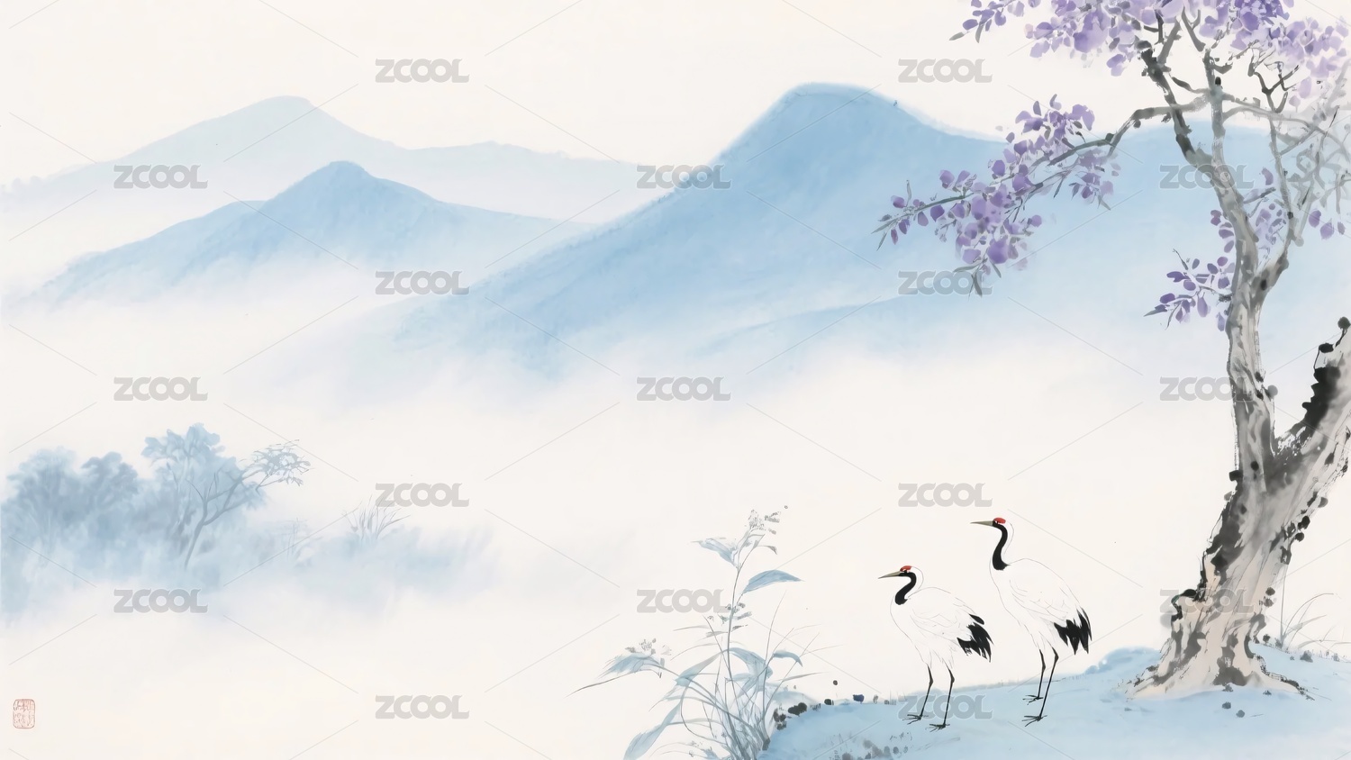 水墨风山水间的仙鹤景致