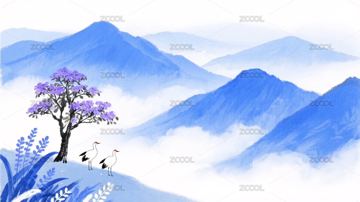 蓝紫色山水间的树与鹤