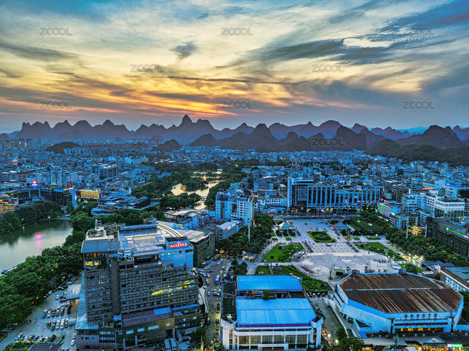 桂林漓江沿岸城市风景自然风光日落晚霞航拍