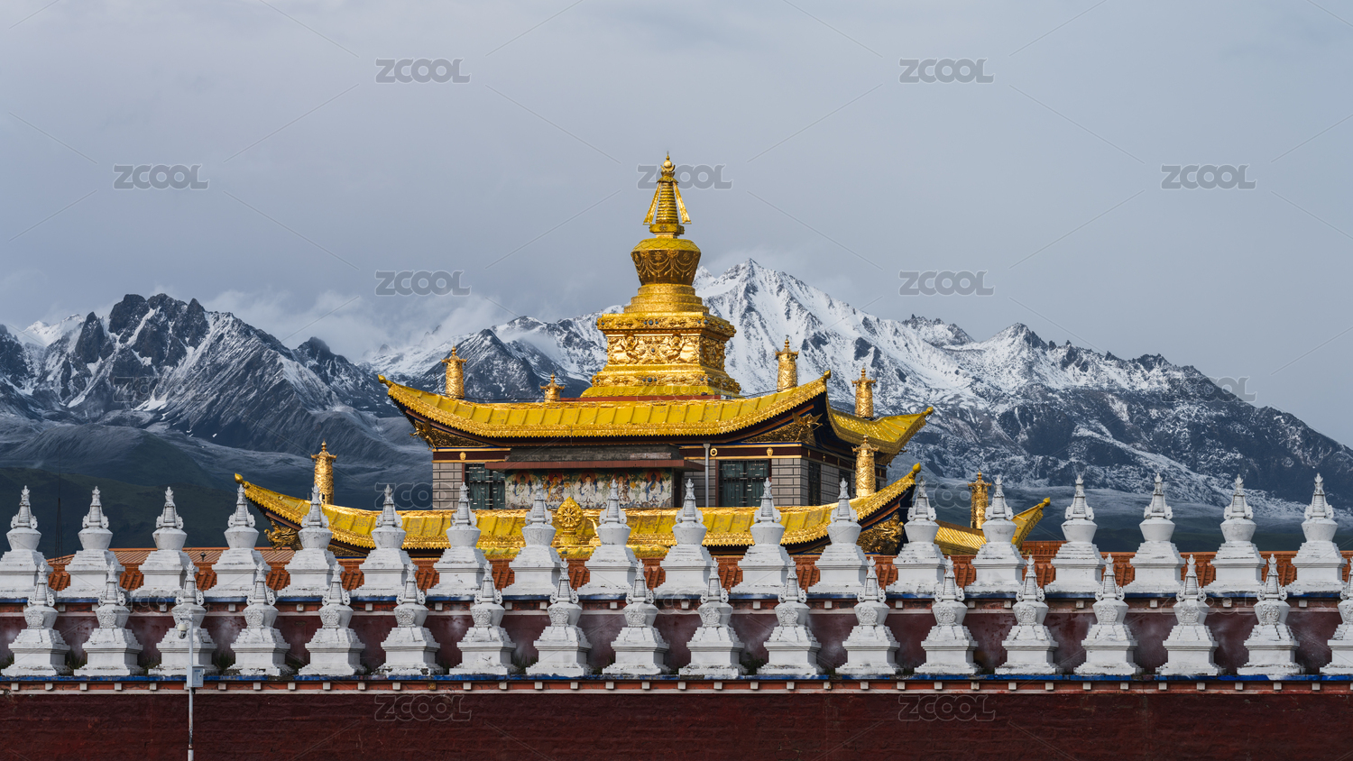 中国四川甘孜康定县塔公寺雅拉雪山自然建筑风光