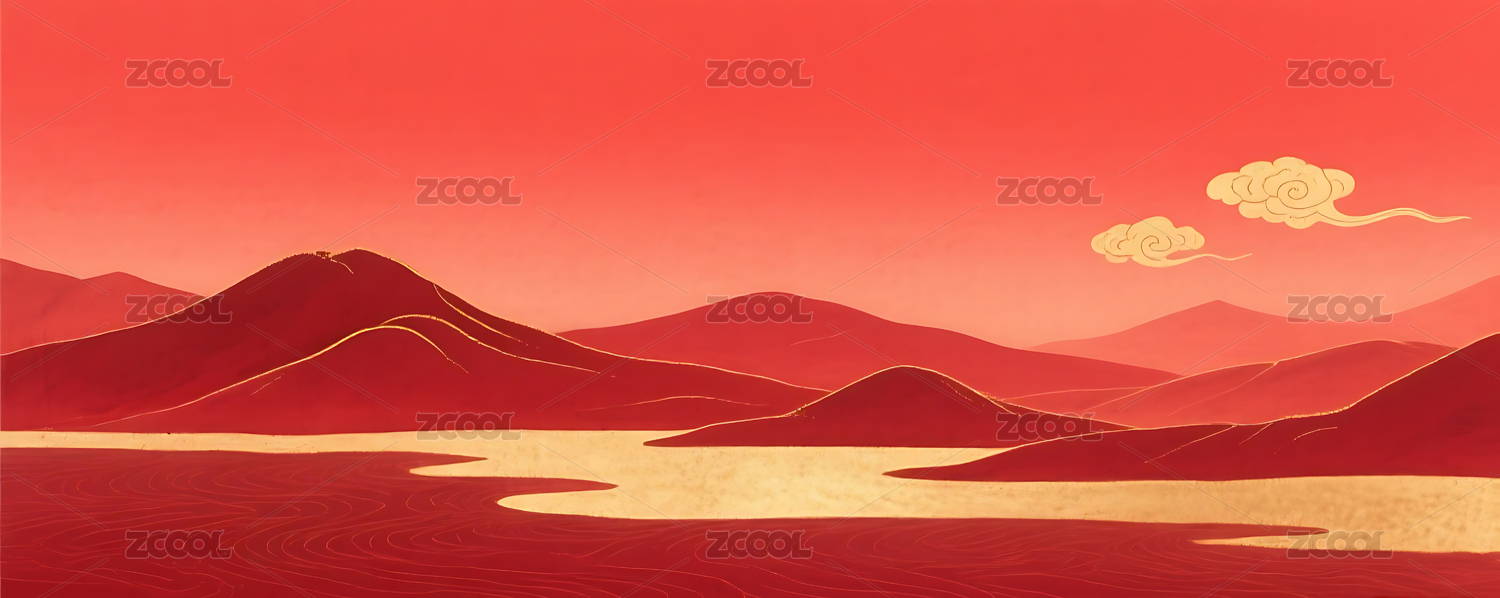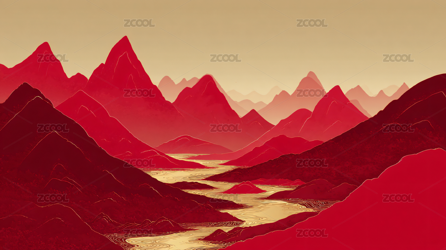 红色,山峦,红日,山水,艺术画,中国风,风景,纹理,线条,金色
