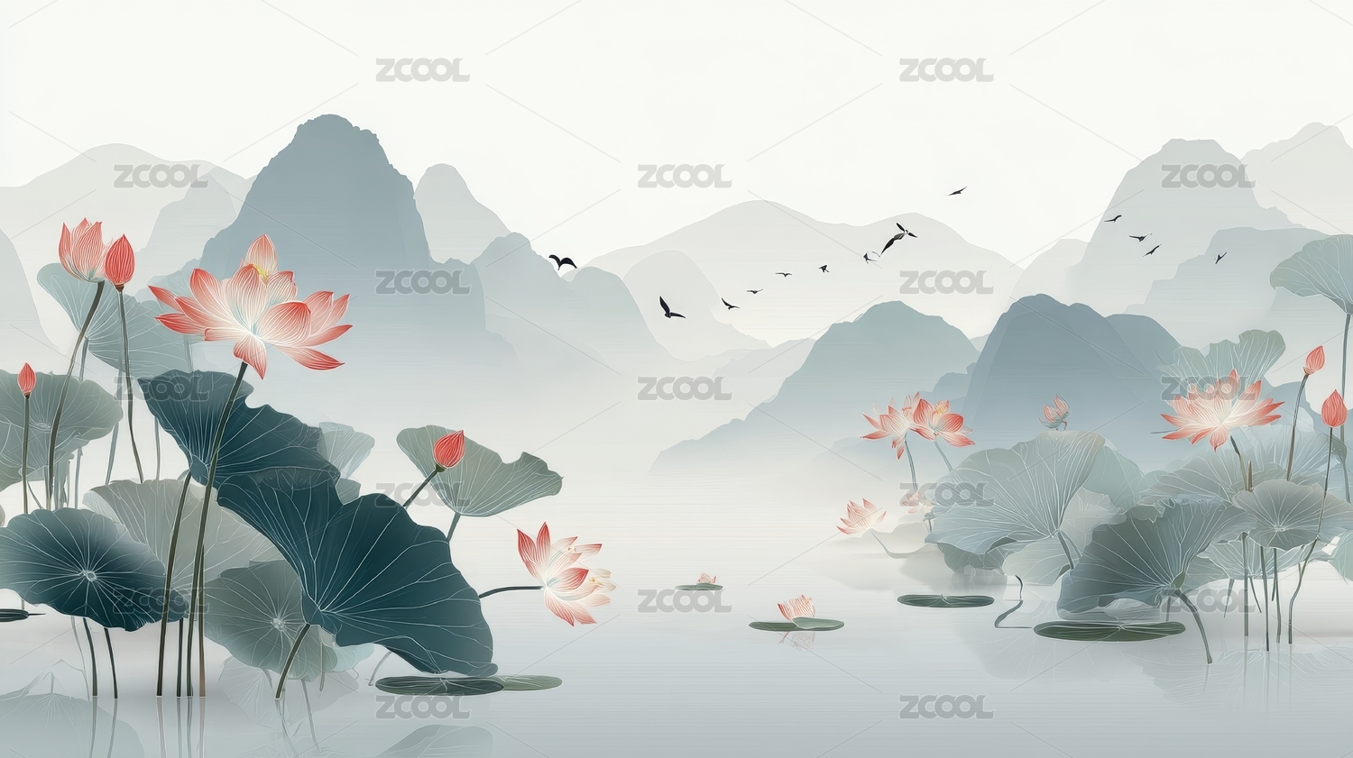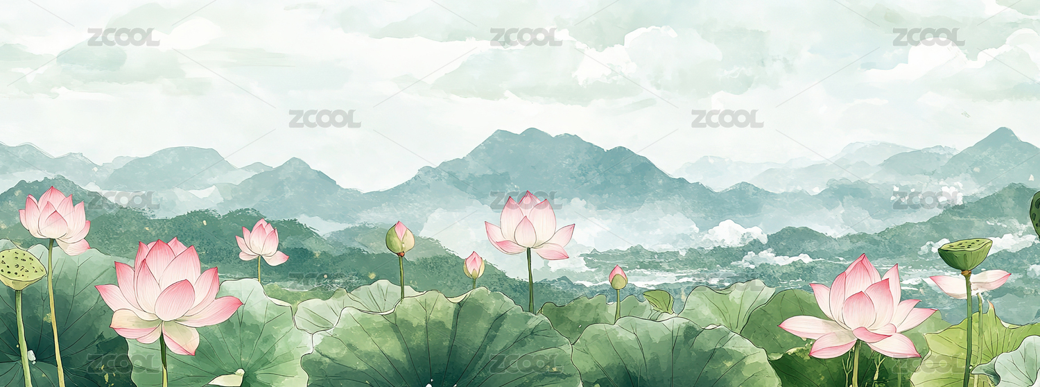 水墨风莲花山水图