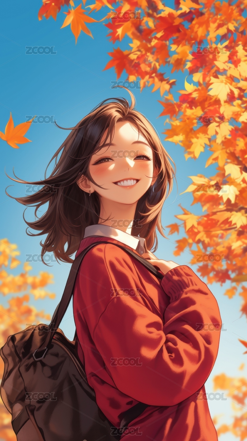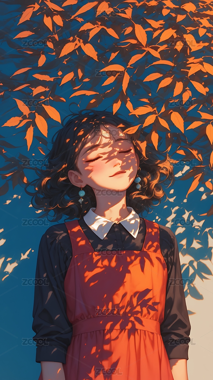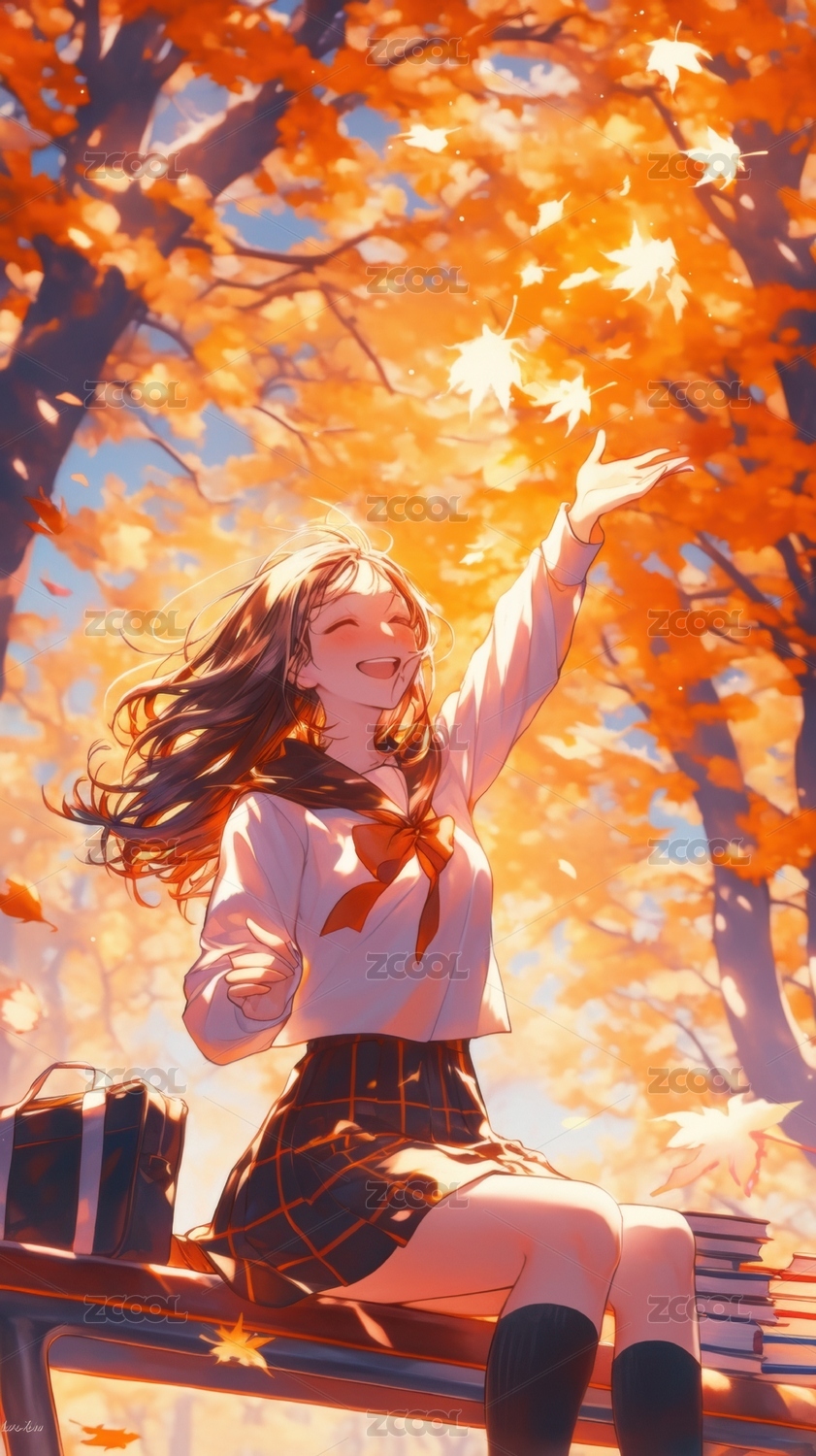 秋日落叶下的女生场景