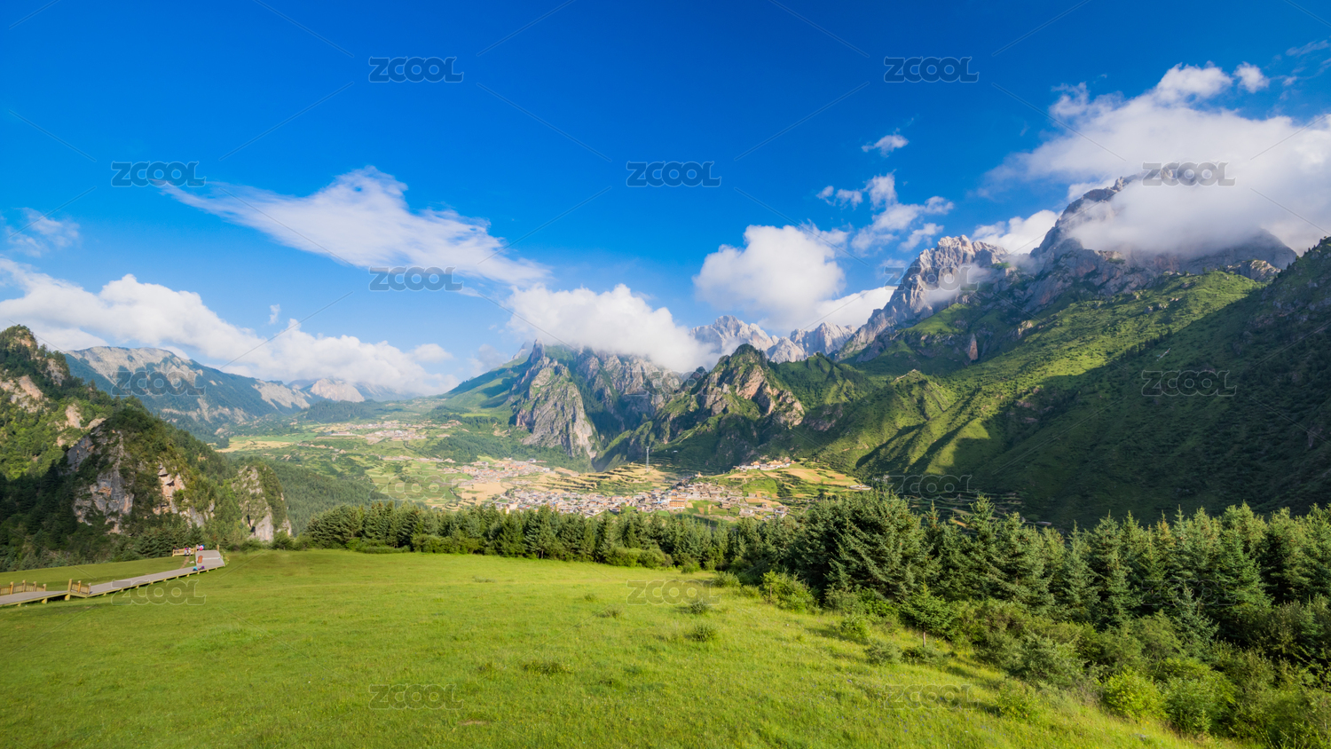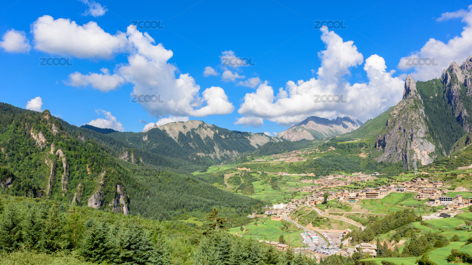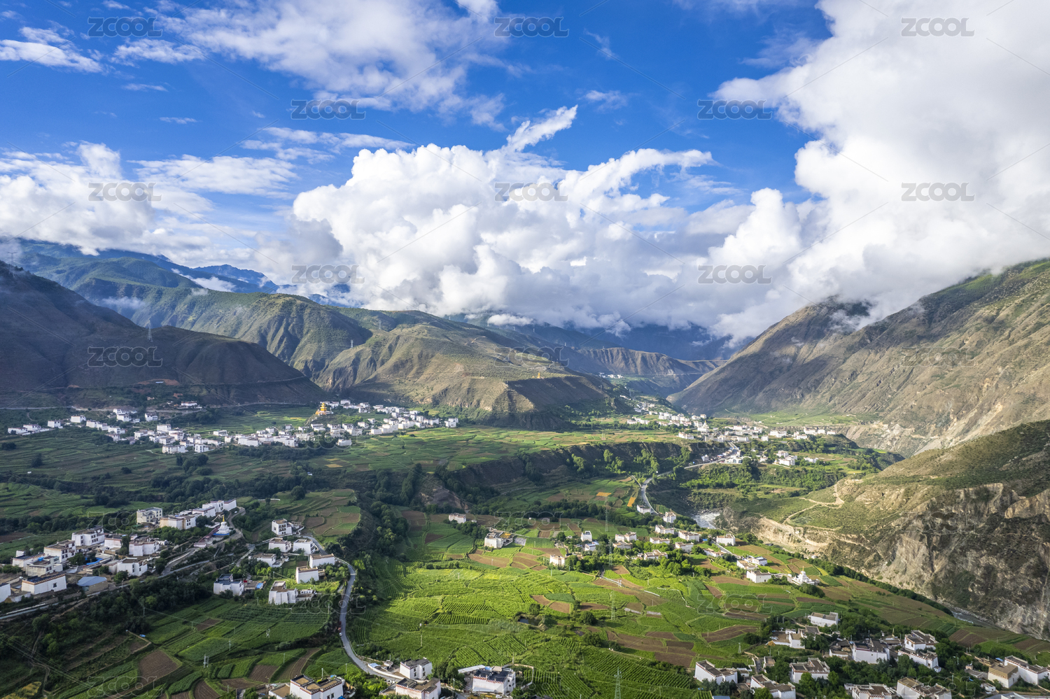 中国西藏林芝高原山脉和草原牧场和村庄美景