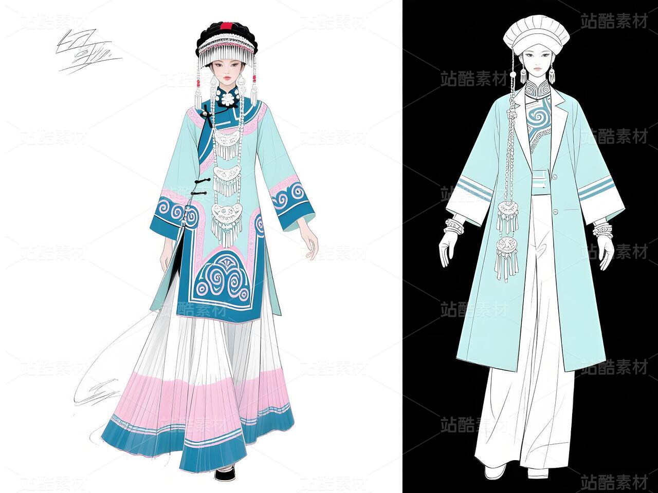本系列高定礼服以白族非遗文化为魂,将传统扎染的浅青渐变与刺绣浅粉花卉巧妙交融。上衣廓形汲取白族坎肩的立体剪裁,裙摆层叠如苍山云海,银丝璎珞纹样沿肩线蜿蜒而下,再现敦煌华彩。外套采用不对称设计,裤装侧缝嵌入民族织带,手套与头饰皆缀有白族银铃元素。通过现代解构手法,让雪山清泉的蓝与山茶花的粉在高级时装上完成跨越千年的对话,诠释“风花雪月”的东方美学新境。