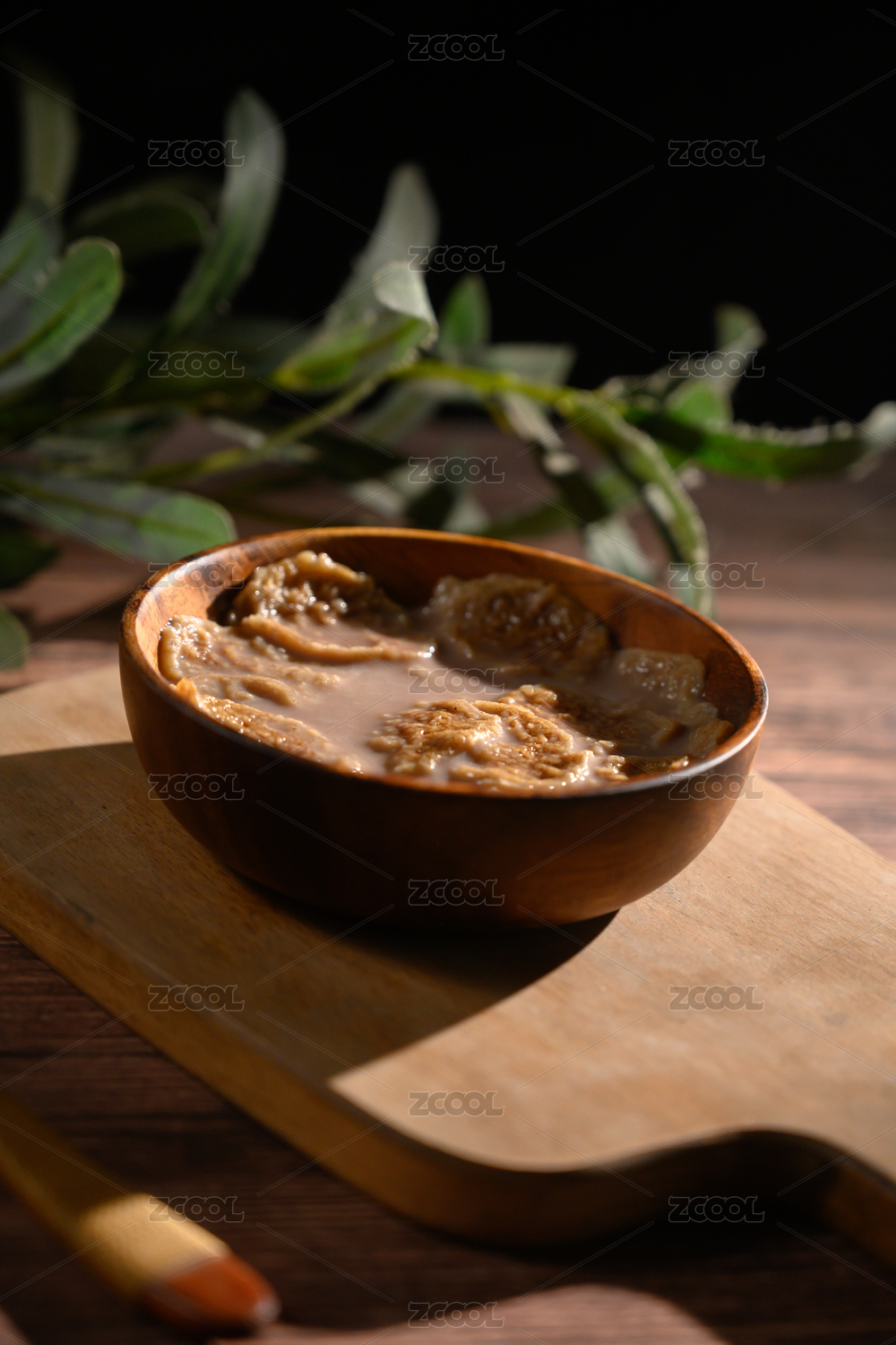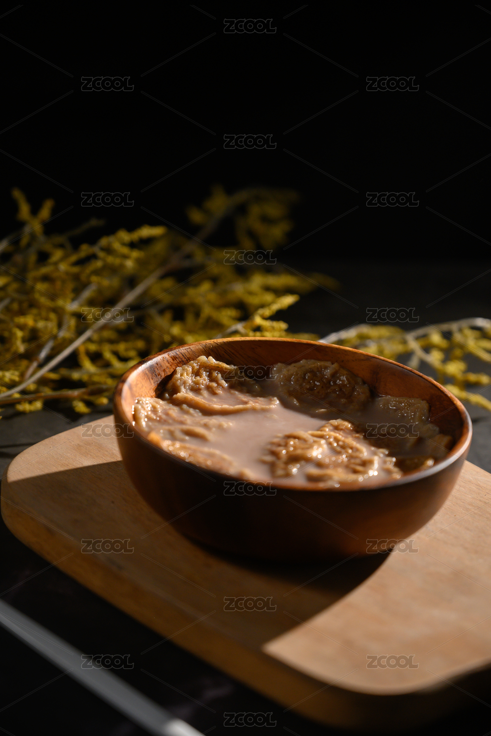 桌面上的碗里的美味可口的牛奶炖桃胶