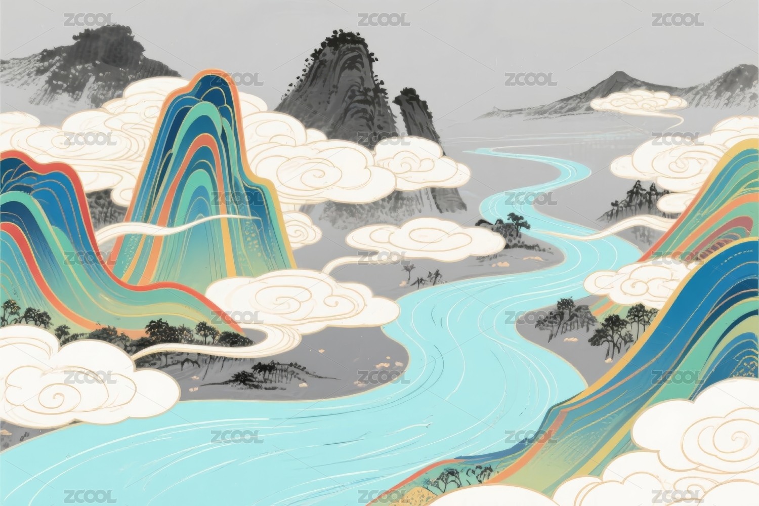 国风新中式水墨山水插画