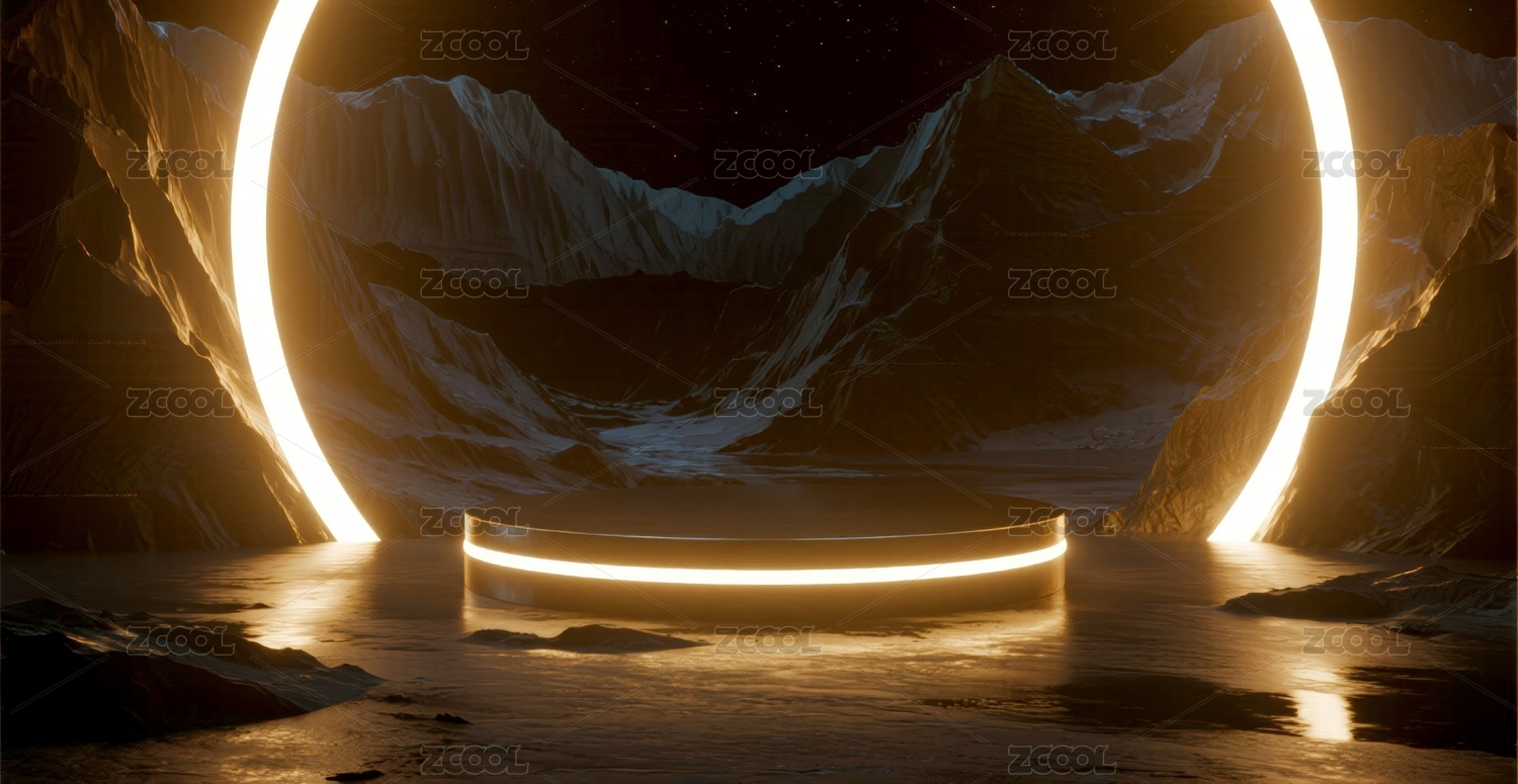 玄幻神秘仙境中的金色圆形展台3D立体插画