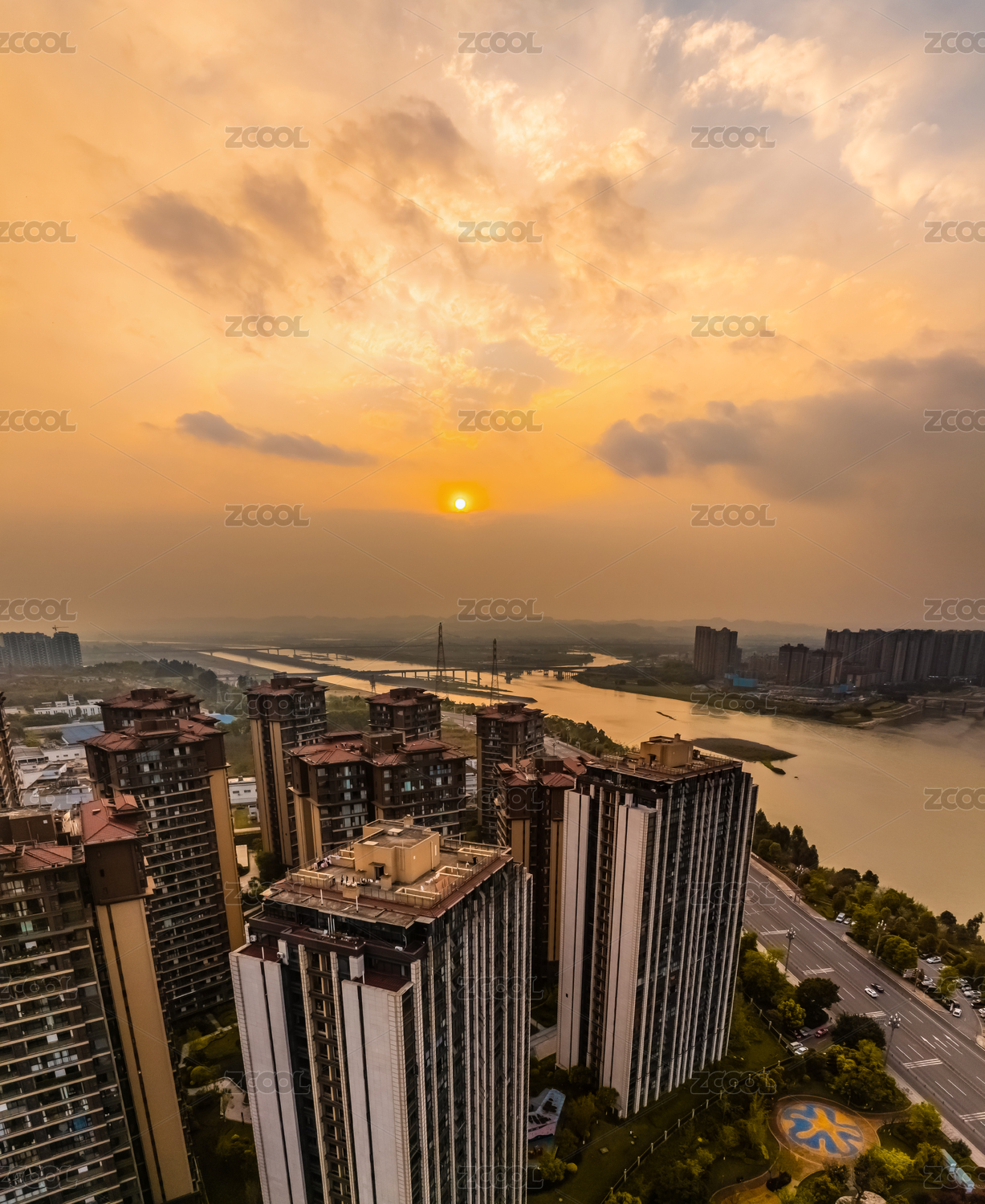 中国四川省乐山市黄昏夕阳大渡河外滩高楼