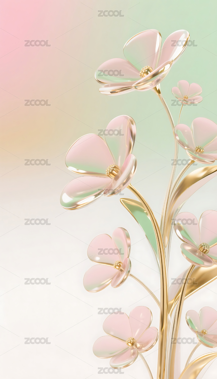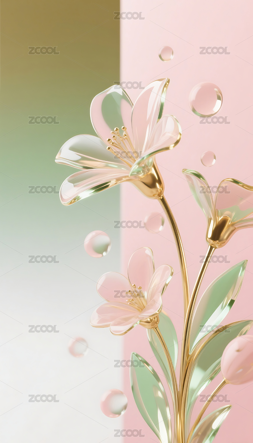 粉绿色3D立体玻璃质感花朵背景