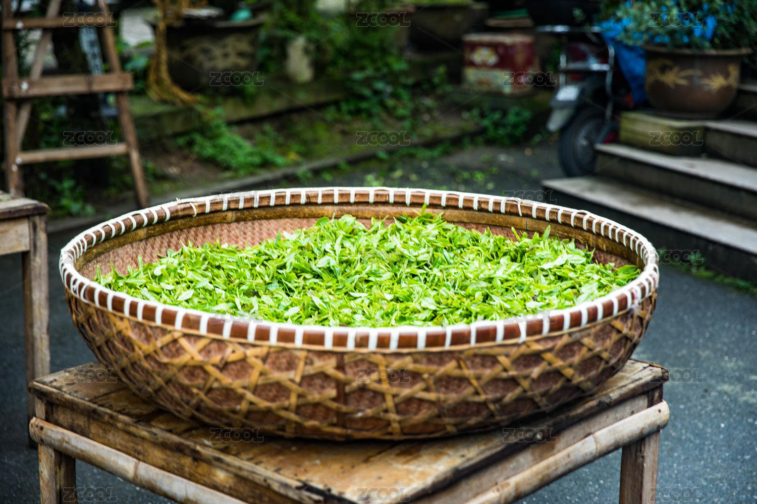 竹筐里正在晾晒的新鲜采摘的绿茶