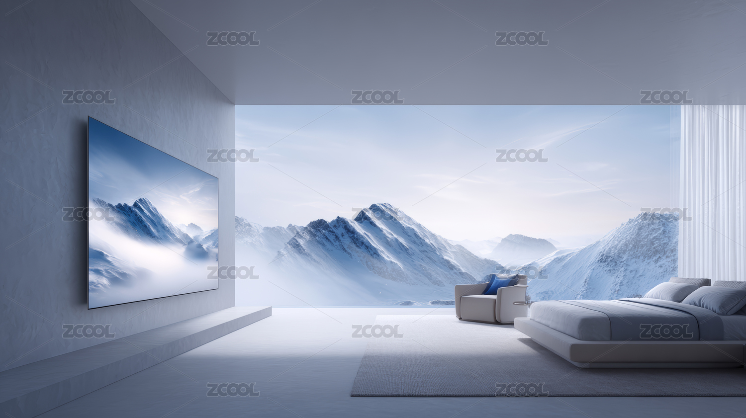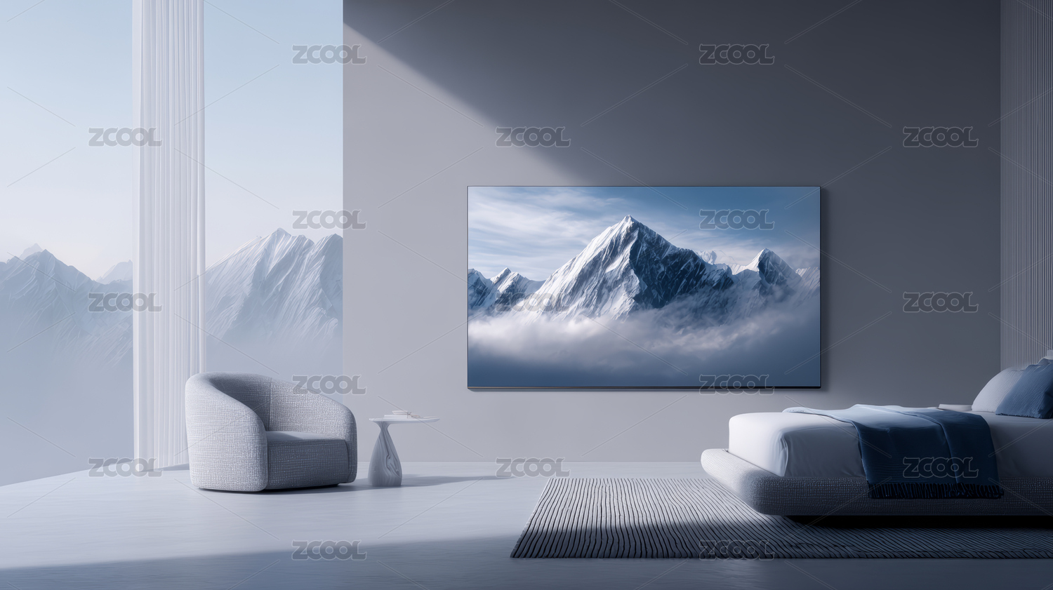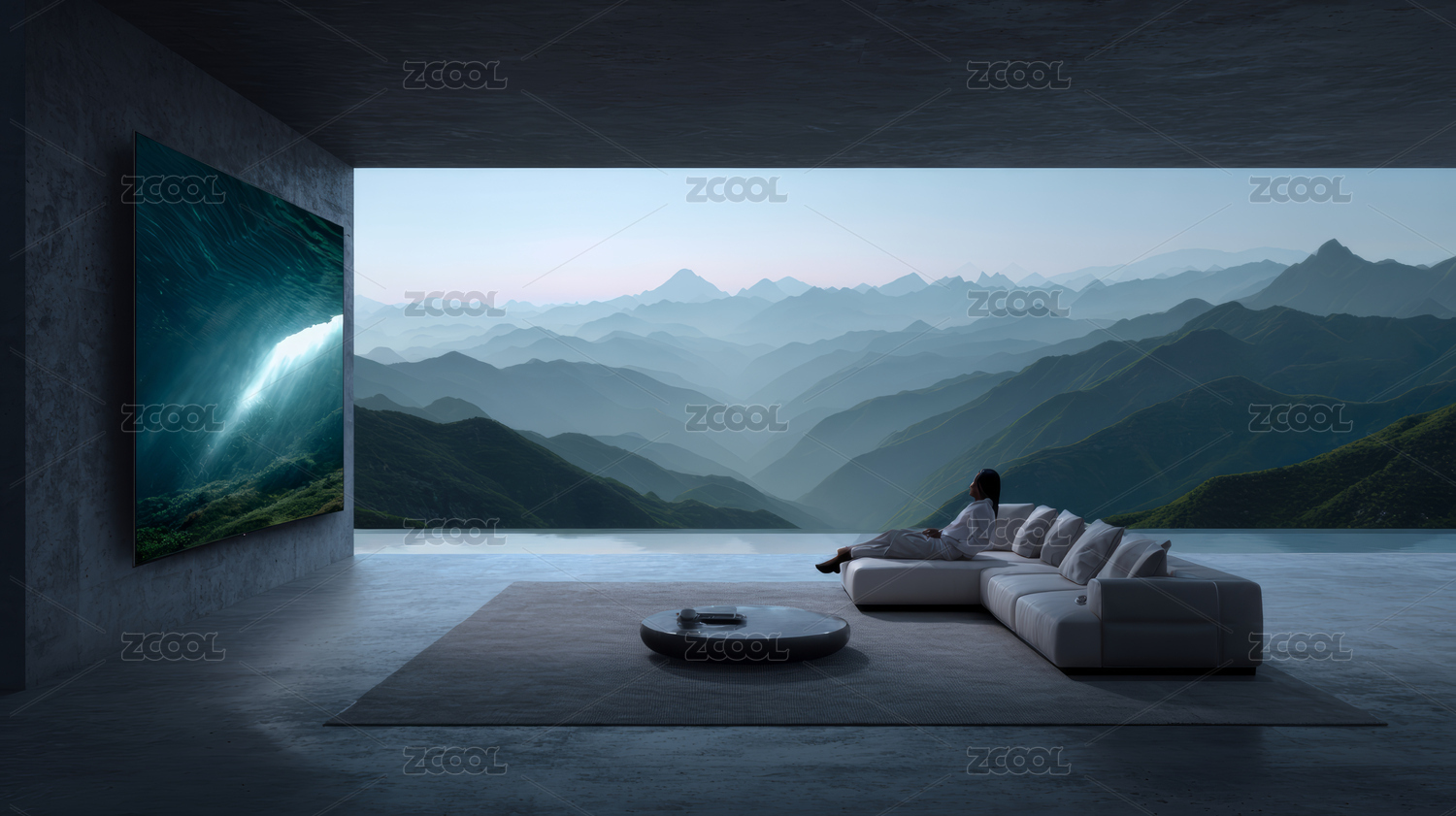 极简客厅的静谧山景