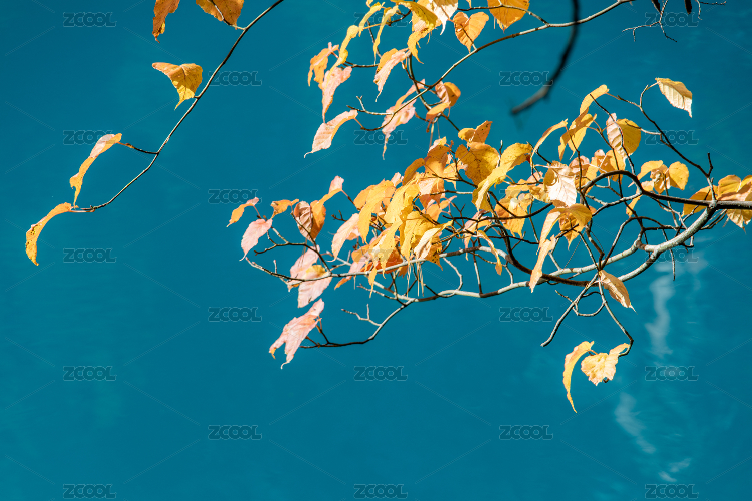 九寨沟秋色,静谧蓝色湖面和金秋黄叶